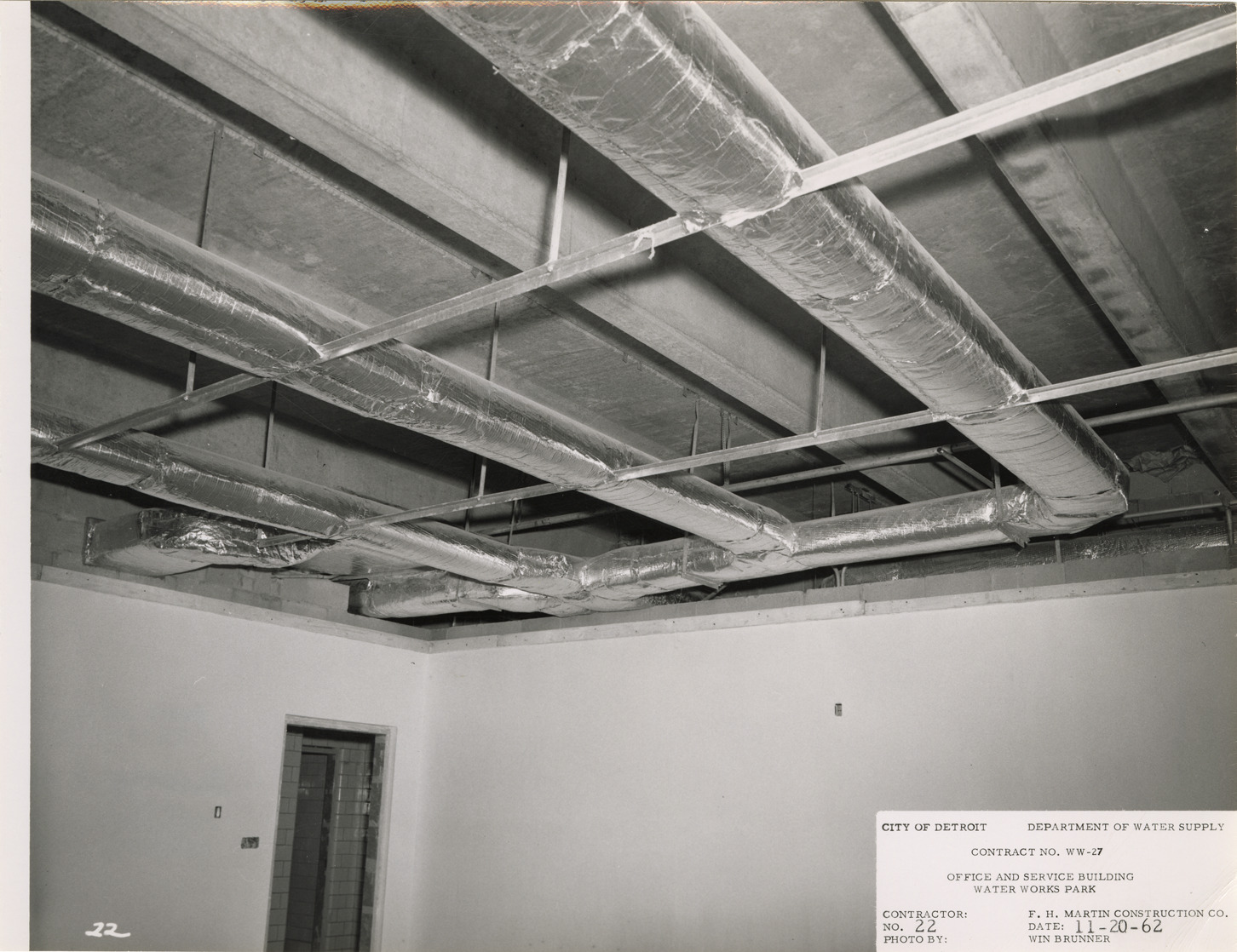 View of insulated ductwork over general office for office and service building, Waterworks Park, Detroit water supply system. Printed on front: "City of Detroit. Dept. of Water Supply. Contract no. WW-27. Office and service building. Water Works Park Station. Contractor: F.H. Martin Construction Co. Photo by: Win Brunner. No. 22. Date: 11-20-62." Typed on back: "Insulated duct work in ceiling area of general office."
