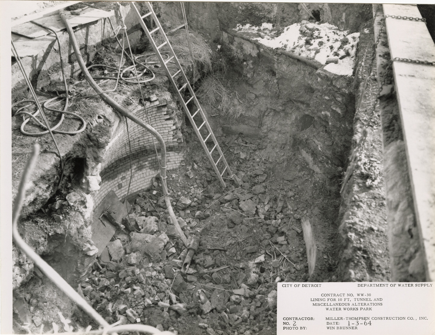 View of demolition of junction well no. 6, Waterworks Park, Detroit water supply system. Printed on front: "City of Detroit. Dept. of Water Supply. Contract no. WW-30. Lining for 10 ft. tunnel and miscellaneous alterations. Water Works Park. Contractor: Miller-Thompsen Construction Co., Inc. Photo by: Win Brunner. No. 2. Date: 1-3-64." Typed on back: "Junction well #6. Demolition 80% complete."