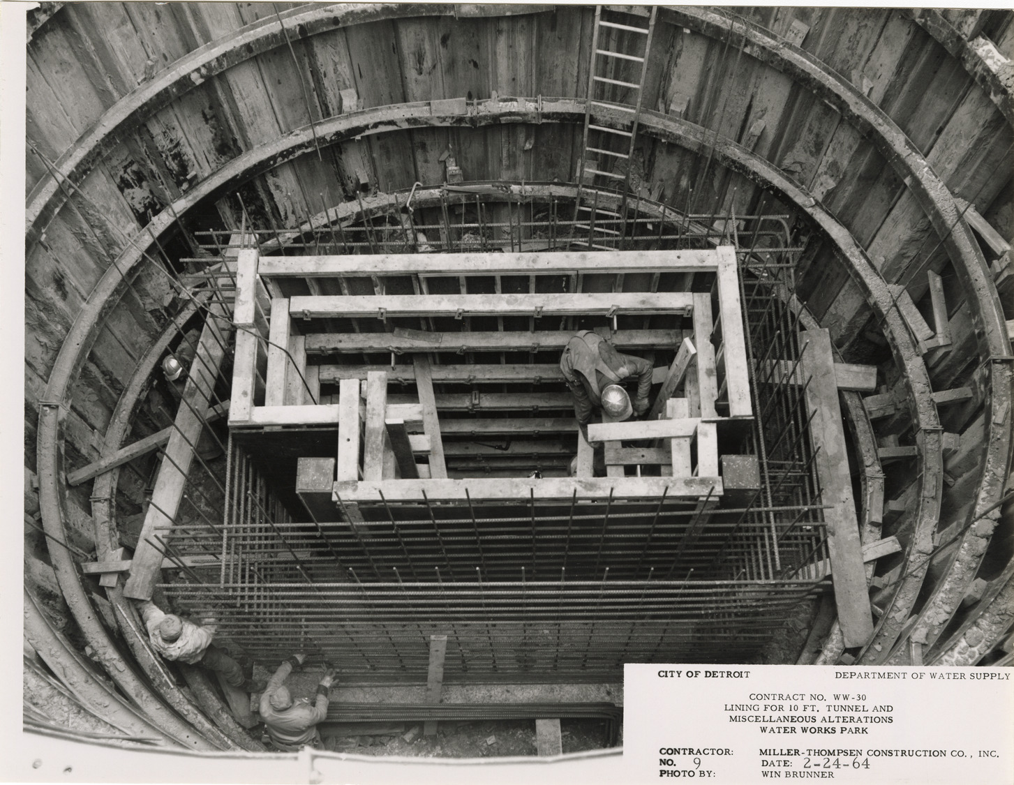 Overhead view of workers installing forms and reinforcing steel for gate well, Waterworks Park, Detroit water supply system. Printed on front: "City of Detroit. Dept. of Water Supply. Contract no. WW-30. Lining for 10 ft. tunnel and miscellaneous alterations. Water Works Park. Contractor: Miller-Thompsen Construction Co., Inc. Photo by: Win Brunner. No. 9. Date: 2-24-64." Typed on back: "Inside forms and reinf. steel for gate well #5. Elev. 82.0' to elev. 93.5'."