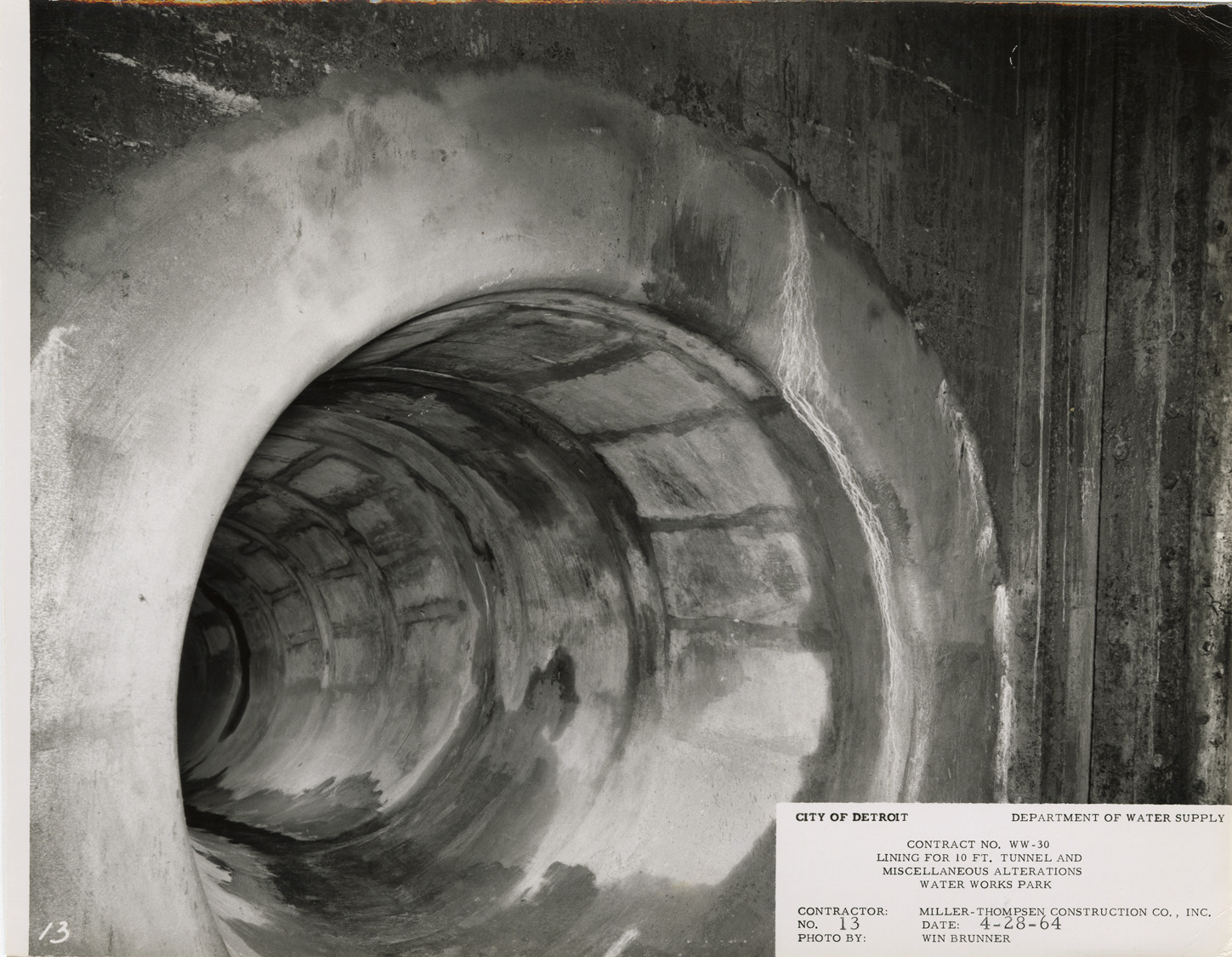 View of tunnel during construction, Waterworks Park, Detroit water supply system. Printed on front: "City of Detroit. Dept. of Water Supply. Contract no. WW-30. Lining for 10 ft. tunnel and miscellaneous alterations. Water Works Park. Contractor: Miller-Thompsen Construction Co., Inc. Photo by: Win Brunner. No. 13. Date: 4-28-64." Typed on back: "Looking north from Weir chamber."