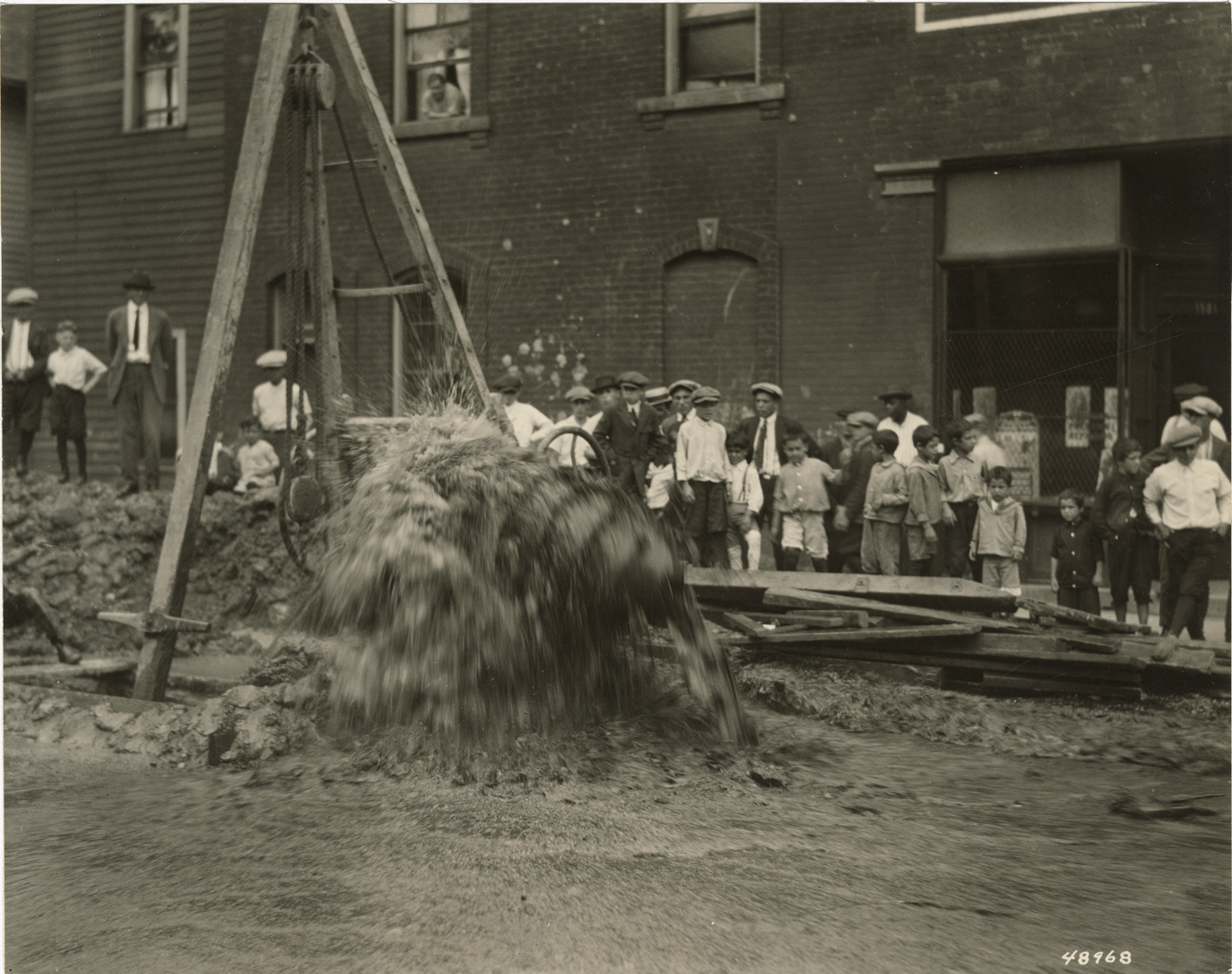 View of children watching a water main being flushed at Mullet St. and Chene St. in Detroit, Michigan. Stamped on back: "Manning Bros., commercial photographers. 504-505 Lincoln Building. Corner State and Park Sts., Detroit, Mich." Label on back: "Cleaning 30' main in Mullet & Chene Sts. etc. to Michigan & Washington Blvd. Mechanical cleaner just leaving end of pipe. Chene and Mullet, 9-3-22. Nat'l Water Main Cleaning Co."