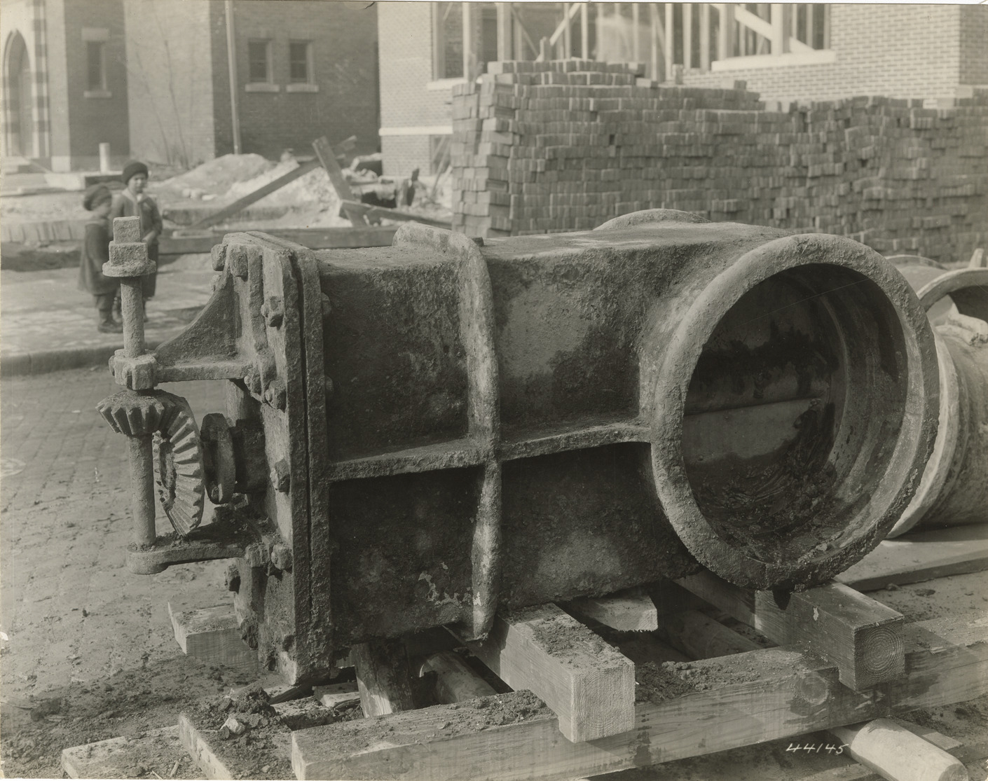 View of a section of a water main. Two children in background. Stamped on back: "Manning Bros., commercial photographers. 504-505 Lincoln Building. Corner State and Park Sts., Detroit, Mich."