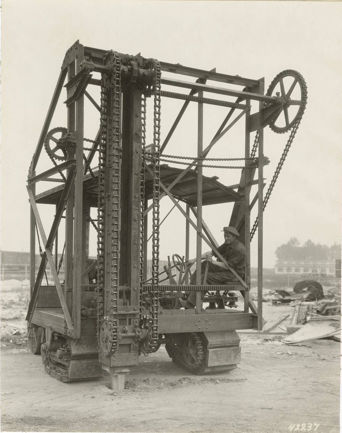 View of a man operating an earth boring machine or apparatus, Detroit water supply system. Stamped on back: "Manning Bros., commercial photographers. 504-505 Lincoln Building. Corner State and Park Sts., Detroit, Mich."