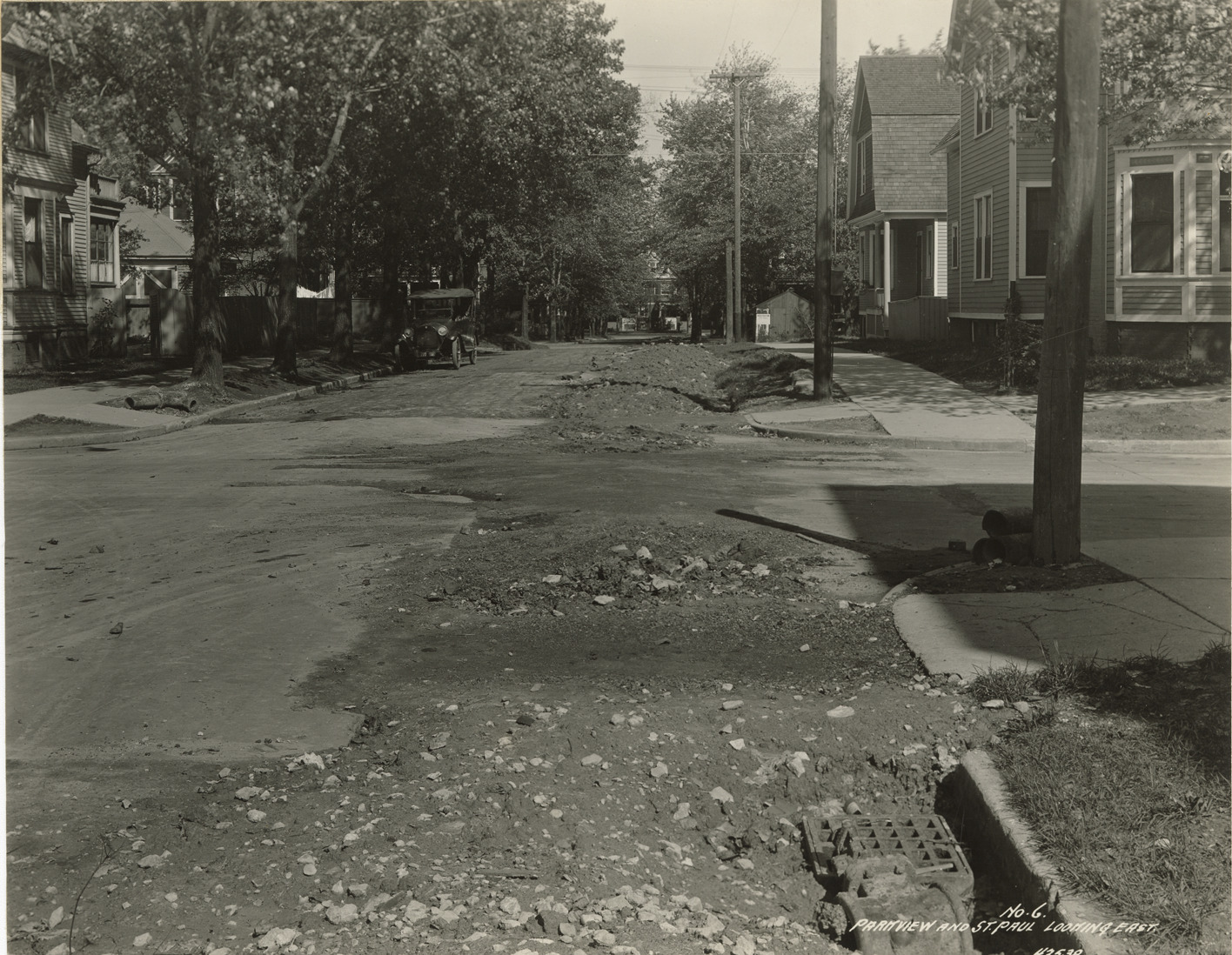 View of water main work at Park View Ave. and St. Paul Ave. in Detroit. Houses and car in background. Printed on front: "No. 6. Parkview and St. Paul looking east." Stamped on back: "Manning Bros., commercial photographers. 504-505 Lincoln Building. Corner State and Park Sts., Detroit, Mich."