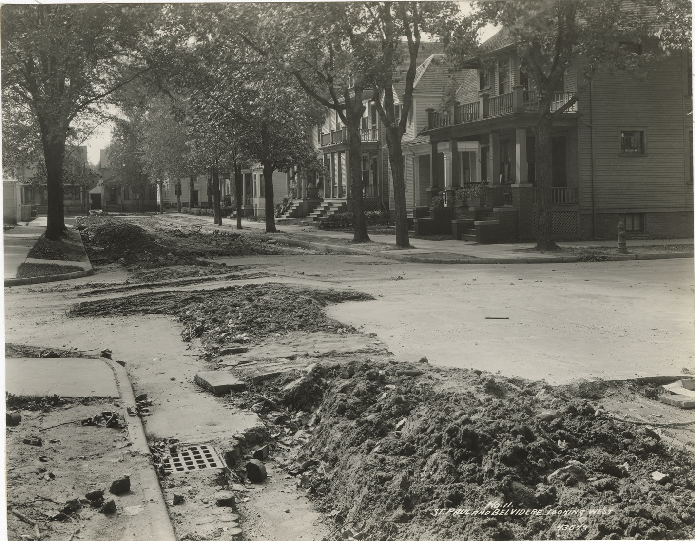 View of water main work at St. Paul Ave. and Belvidere Ave. in Detroit. Wooden-frame houses in background. Printed on front: "No. 11. St. Paul and Belvidere looking west." Stamped on back: "Manning Bros., commercial photographers. 504-505 Lincoln Building. Corner State and Park Sts., Detroit, Mich."