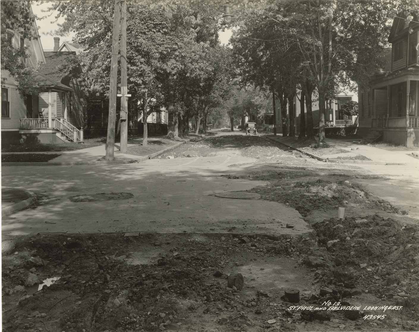 View of water main work at St. Paul Ave. and Belvidere Ave. in Detroit. Wooden-frame houses and car in background. Printed on front: "No. 13. St. Paul and Belvidere looking east." Stamped on back: "Manning Bros., commercial photographers. 504-505 Lincoln Building. Corner State and Park Sts., Detroit, Mich."