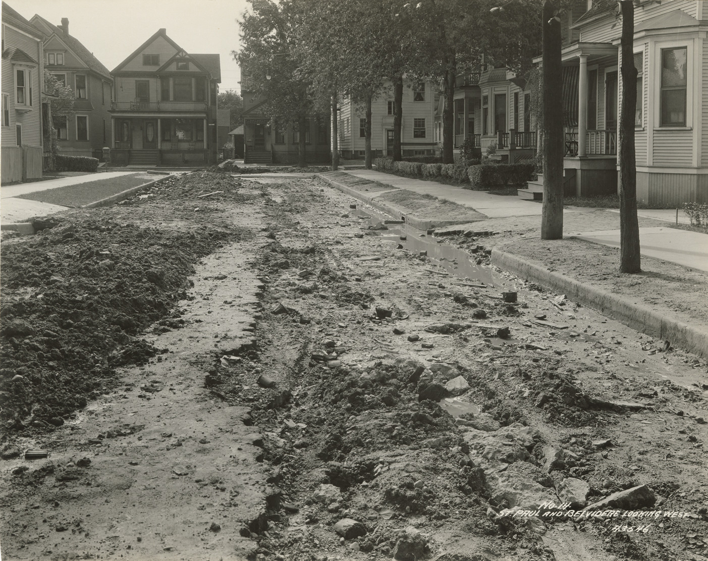 View of water main work at St. Paul Ave. and Belvidere Ave. in Detroit. Wooden-frame houses. Printed on front: "No. 14. St. Paul and Belvidere looking west." Stamped on back: "Manning Bros., commercial photographers. 504-505 Lincoln Building. Corner State and Park Sts., Detroit, Mich."