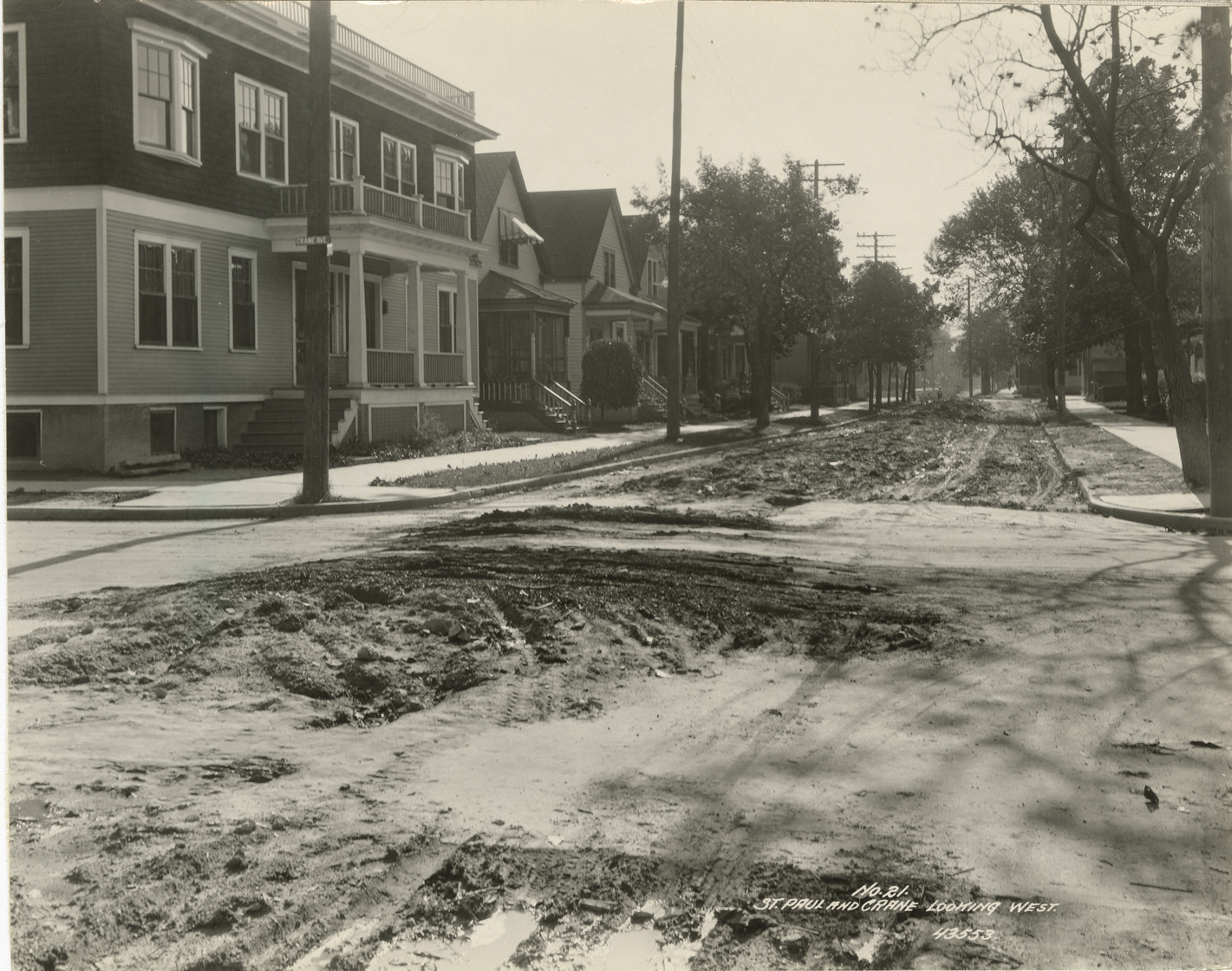 View of water main work at St. Paul Ave. and Crane Ave. in Detroit. Wooden-frame houses in background. Printed on front: "No. 21. St. Paul and Crane looking west." Stamped on back: "Manning Bros., commercial photographers. 504-505 Lincoln Building. Corner State and Park Sts., Detroit, Mich."
