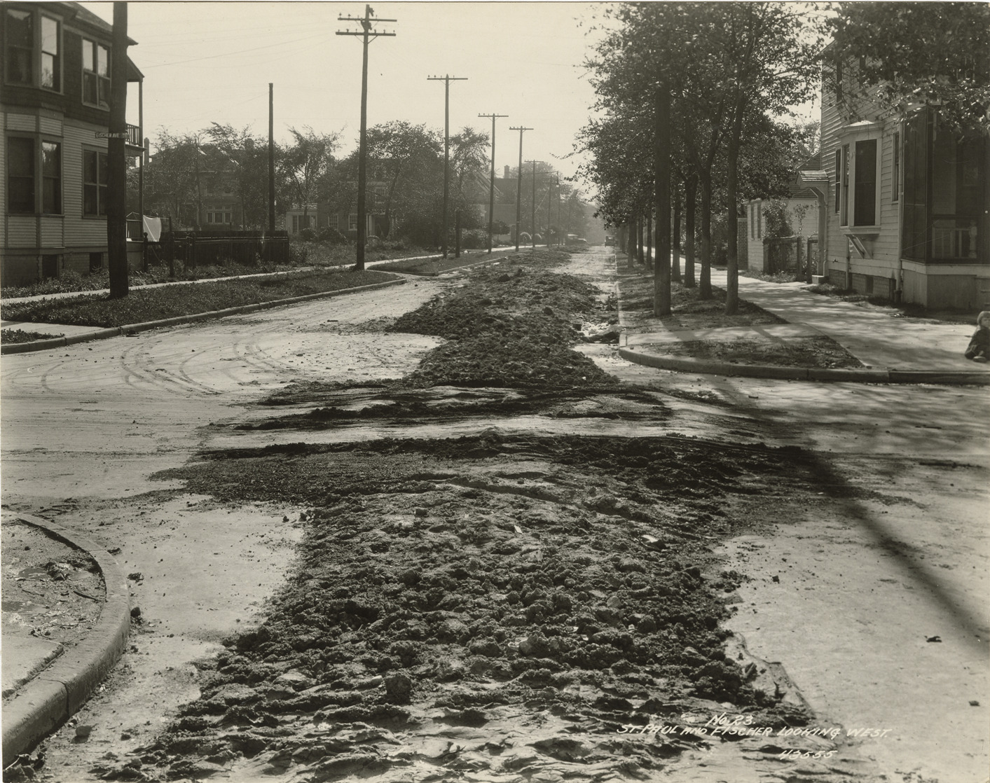 View of water main work at St. Paul Ave. and Fischer Ave. in Detroit. Wooden-frame houses in background. Printed on front: "No. 23. St. Paul and Fischer looking west." Stamped on back: "Manning Bros., commercial photographers. 504-505 Lincoln Building. Corner State and Park Sts., Detroit, Mich."