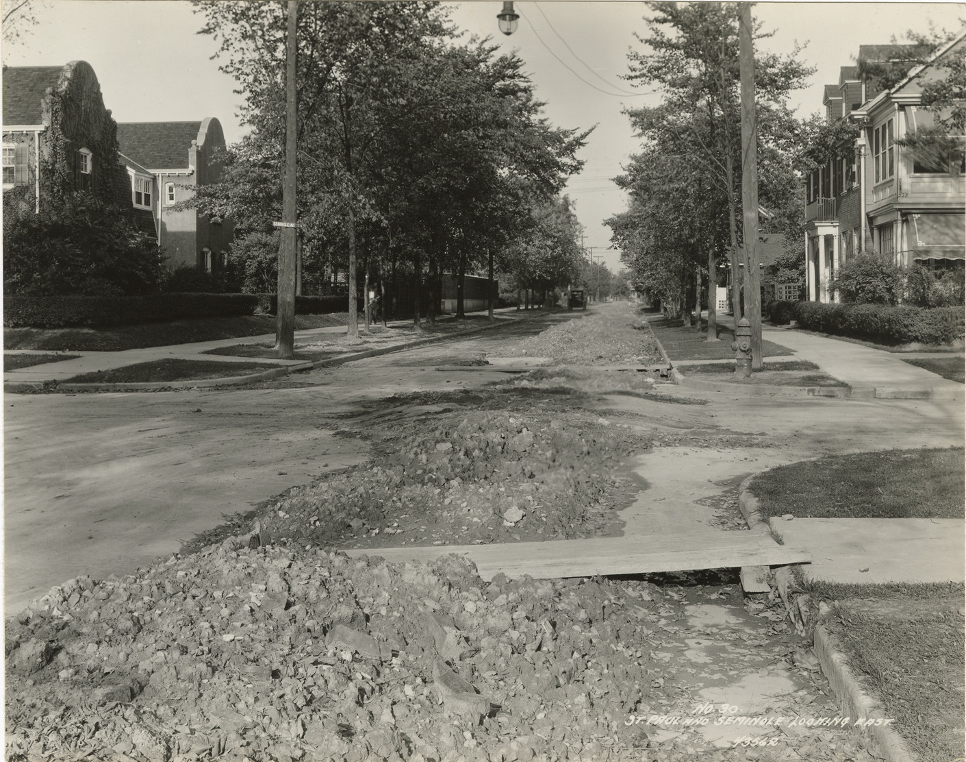 View of water main work at St. Paul Ave. and Seminole Ave. in Detroit. Houses in background. Printed on front: "No. 30. St. Paul and Seminole looking east." Stamped on back: "Manning Bros., commercial photographers. 504-505 Lincoln Building. Corner State and Park Sts., Detroit, Mich."