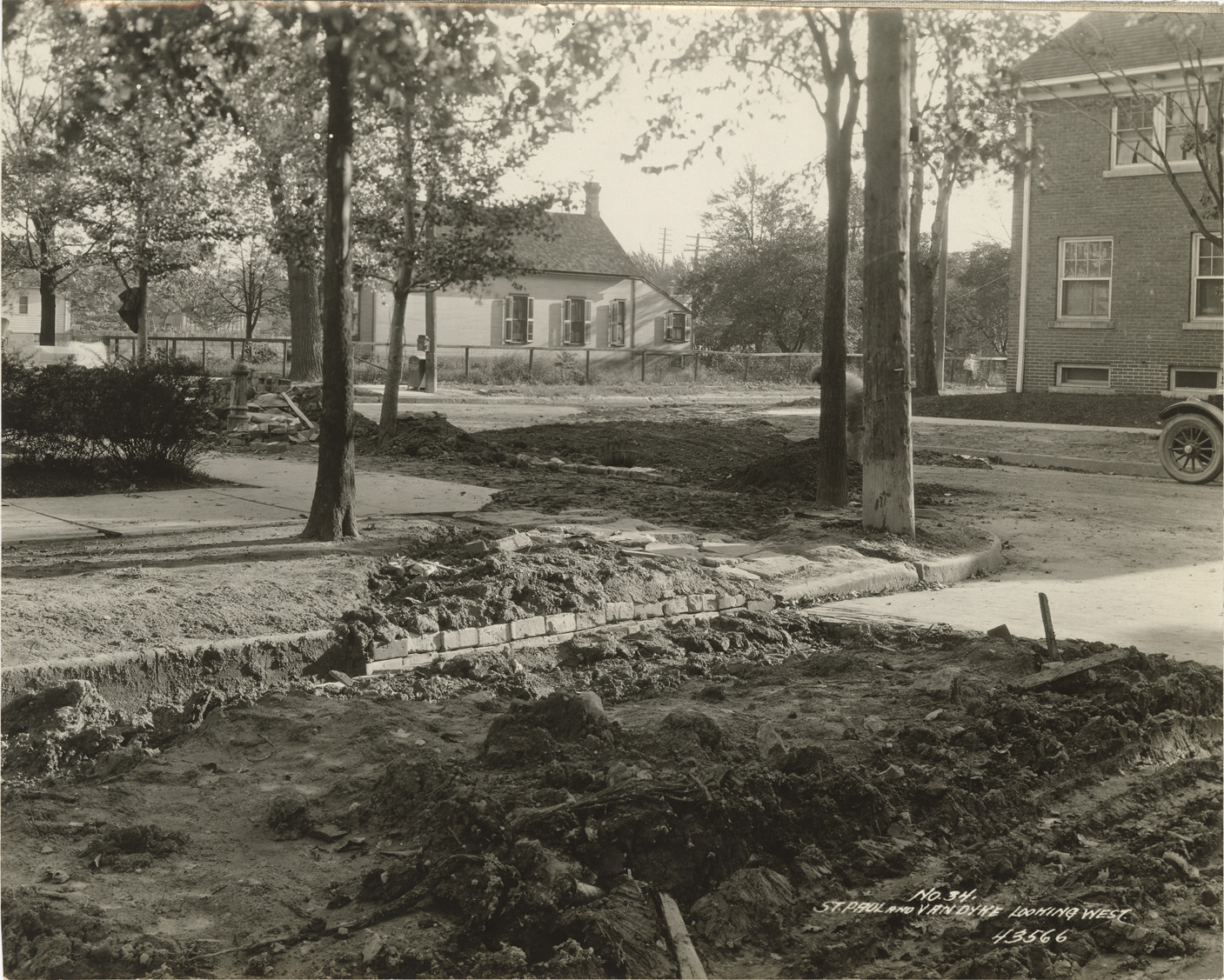 View of water main work at St. Paul Ave. and Van Dyke Ave. in Detroit. Houses in background. Printed on front: "No. 34. St. Paul and Van Dyke looking west." Stamped on back: "Manning Bros., commercial photographers. 504-505 Lincoln Building. Corner State and Park Sts., Detroit, Mich."