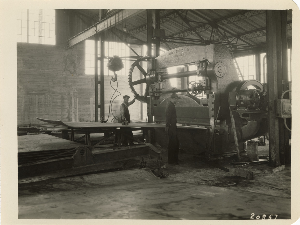 View of worker at United Welding Co. factory, Middletown, Ohio, operating pipe fabricating machine by the Geo. Whiting Co. Stamped on back: "Photographic Dept. The American Rolling Mill Co. Middletown, O. When ordering duplicates refer to number on face of print." Sheet accompanying photographs: "Contract 1929-2. 54" Armco iron pipe in 8 Mile Rd.--John R St. to Livernois Ave. Awarded May 15, 1929 to Julius Porath & Son. Pipe fabricated by United Welding Co., Middletown, Ohio."