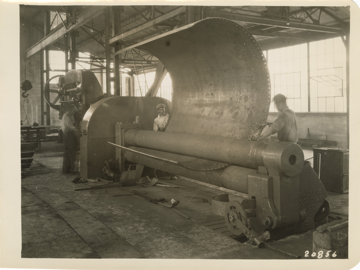 View of workers at United Welding Co. factory, Middletown, Ohio, operating pipe fabricating machinery. Stamped on back: "Photographic Dept. The American Rolling Mill Co. Middletown, O. When ordering duplicates refer to number on face of print." Sheet accompanying photographs: "Contract 1929-2. 54" Armco iron pipe in 8 Mile Rd.--John R St. to Livernois Ave. Awarded May 15, 1929 to Julius Porath & Son. Pipe fabricated by United Welding Co., Middletown, Ohio."