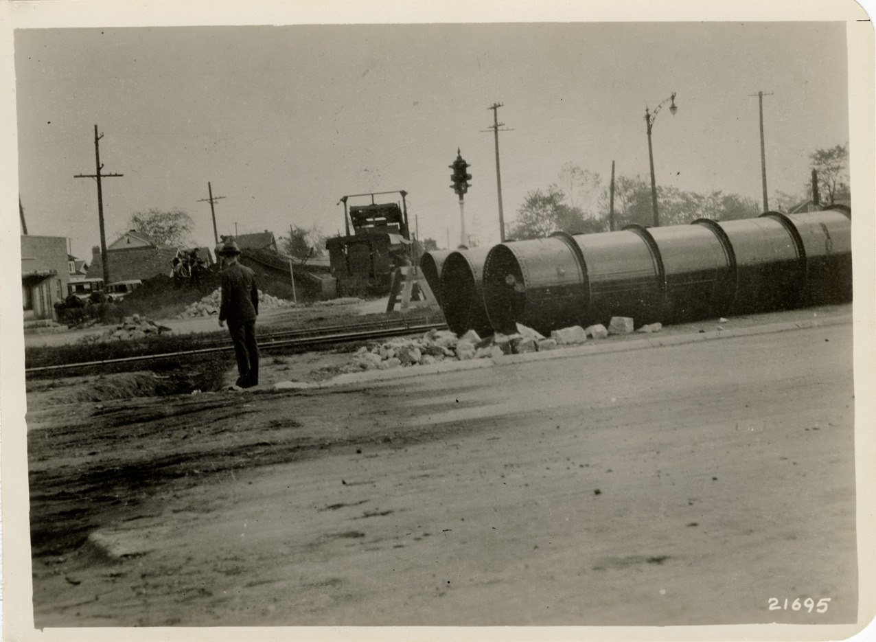 View of iron pipe manufactured for Detroit water supply system by United Welding Co. in Middletown, Ohio. Man in foreground; pipe-laying equipment in background. Stamped on back: "Photographic Dept. The American Rolling Mill Co. Middletown, O. When ordering duplicates refer to number on face of print." Sheet accompanying photographs: "Contract 1929-2. 54" Armco iron pipe in 8 Mile Rd.--John R St. to Livernois Ave. Awarded May 15, 1929 to Julius Porath & Son. Pipe fabricated by United Welding Co., Middletown, Ohio."