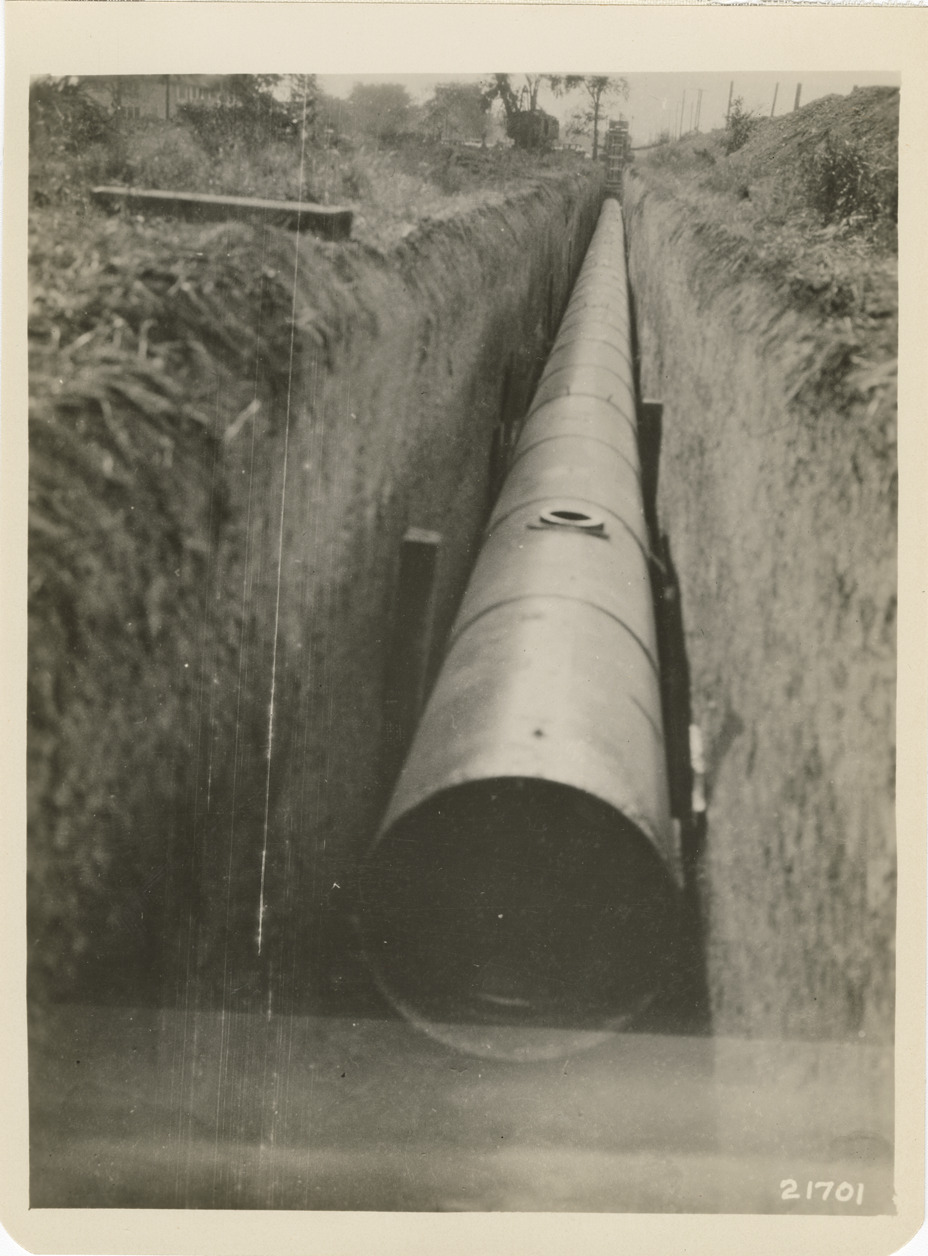 View of iron pipe, manufactured by United Welding Co., Middletown, Ohio for Detroit water supply system. Stamped on back: "Photographic Dept. The American Rolling Mill Co. Middletown, O. When ordering duplicates refer to number on face of print." Sheet accompanying photographs: "Contract 1929-2. 54" Armco iron pipe in 8 Mile Rd.--John R St. to Livernois Ave. Awarded May 15, 1929 to Julius Porath & Son. Pipe fabricated by United Welding Co., Middletown, Ohio."