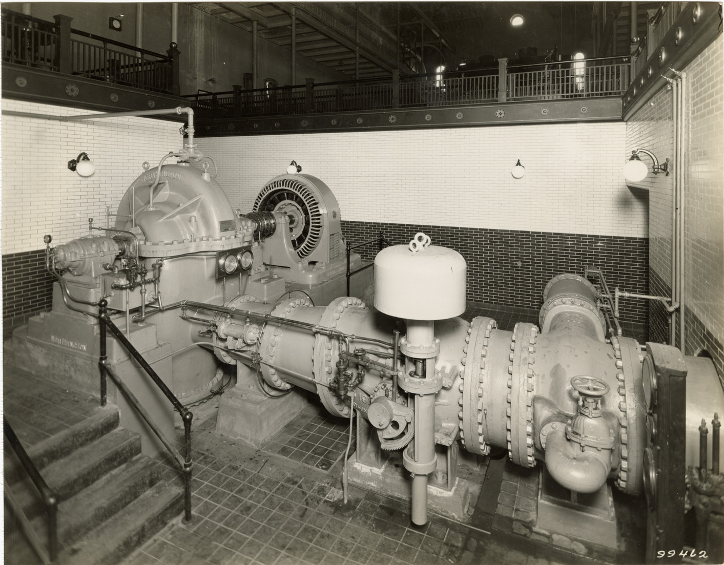 View of pump no. 14, Waterworks Park, Detroit water supply system. Stamped on back: "Manning Bros., commercial photographers. 504-505 Lincoln Building. Corner State and Park Sts., Detroit, Mich." Typed on back: "Water Works Park, July 1929. Pump #14 completed."