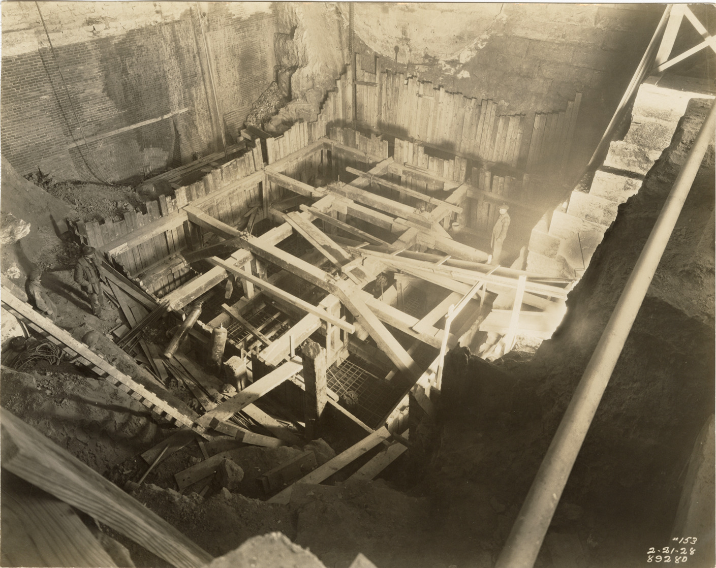 View of construction of suction chamber for centrifugal pumps, Waterworks Park, Detroit water supply system. Printed on front: "2-21-28." Stamped on back: "Manning Bros., commercial photographers. 504-505 Lincoln Building. Corner State and Park Sts., Detroit, Mich." Typed on back: "Construction of suction chamber for 2 40 m.g.d. motor driven centrifugal pumps at Water Works Park, pumping station no. 1. February 21, 1928."