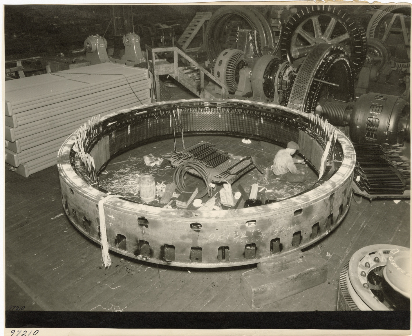 Worker installing stator for pump motor, Waterworks Park, Detroit water supply system