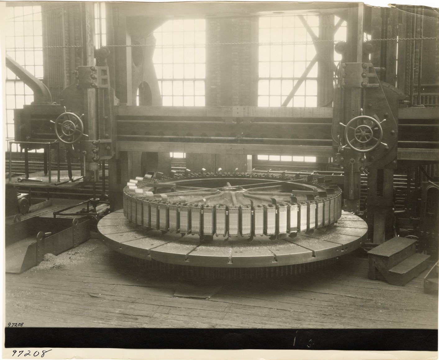 View of rotor for pump motor, Waterworks Park, Detroit water supply system. Stamped on back: "Manning Bros., commercial photographers. 504-505 Lincoln Building. Corner State and Park Sts., Detroit, Mich." Typed on back: "1200 h.p. rotor. Progress of work on vertical pumps now being constructed by Allis-Chalmers Mfg. Co. at Milwaukee. November, 1928."