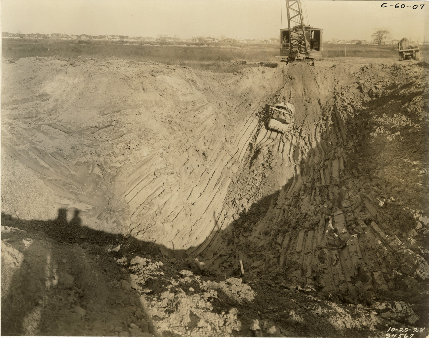 View of drag excavator during excavation for high and low plants, Springwells Station, Detroit water supply system. Printed on front: "10-29-28." Stamped on back: "Manning Bros., commercial photographers. 504-505 Lincoln Building. Corner State and Park Sts., Detroit, Mich." Typed on back: "Springwells Station, Oct. 29, 1928. View looking into high and low lift excavation showing drag line excavator in operation."
