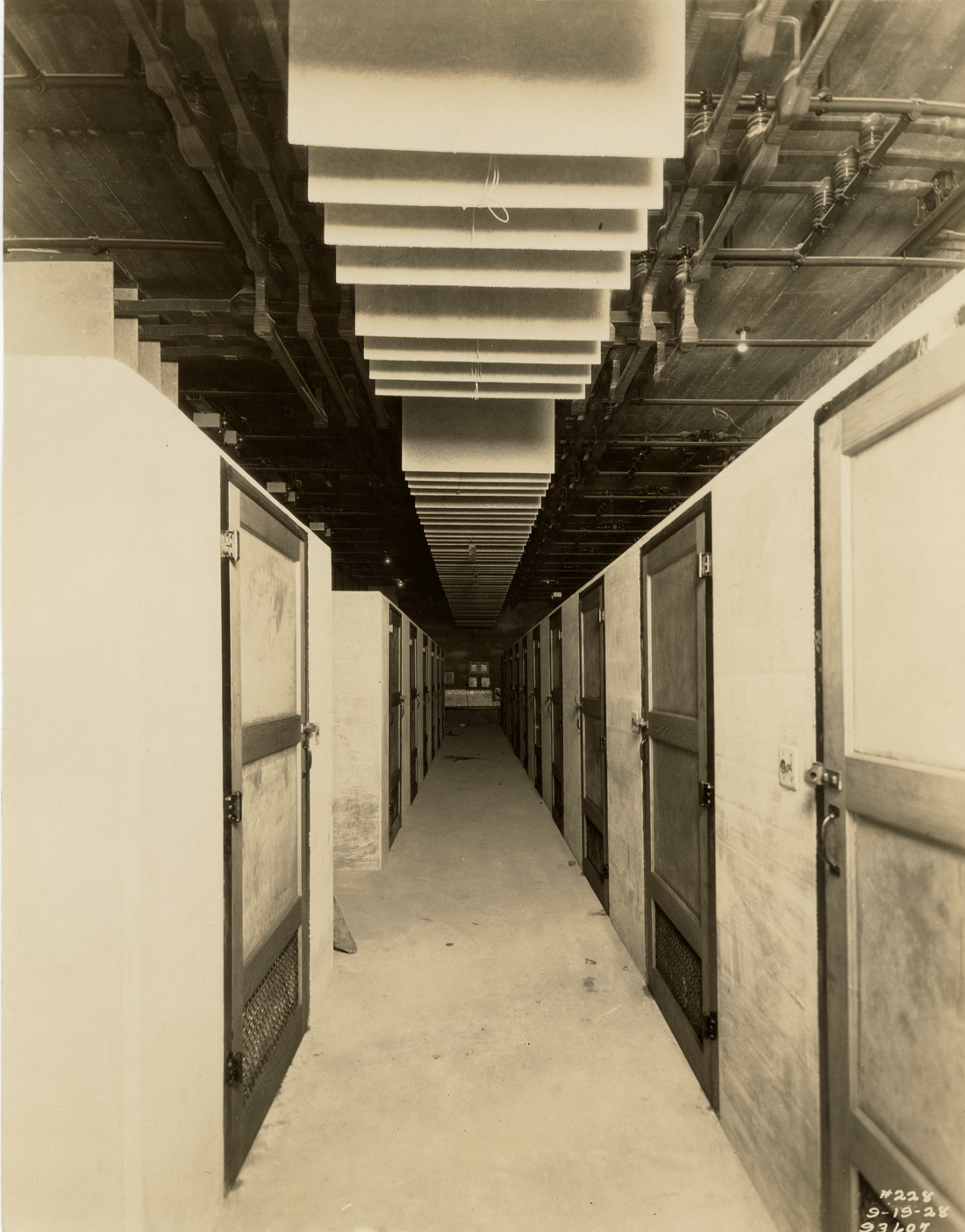 View of cell structures in switch house, Waterworks Park, Detroit water supply system. Printed on front: "9-19-28." Stamped on back: "Manning Bros., commercial photographers. 504-505 Lincoln Building. Corner State and Park Sts., Detroit, Mich." Typed on back: "Water Works Park Station. Cell structures, primary switch house."