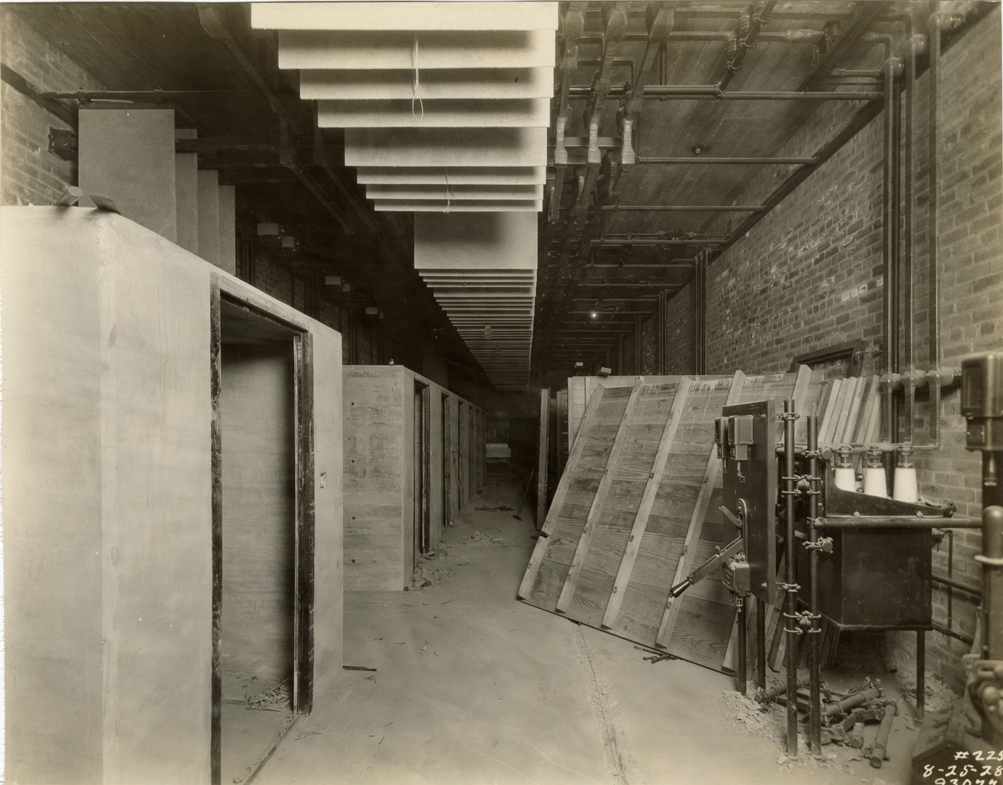 View of cell structures in switch house, Waterworks Park, Detroit water supply system. Printed on front: "8-25-28." Stamped on back: "Manning Bros., commercial photographers. 504-505 Lincoln Building. Corner State and Park Sts., Detroit, Mich." Handwritten on back: "Cell structures under construction. Primary switch house, Water Works Park."