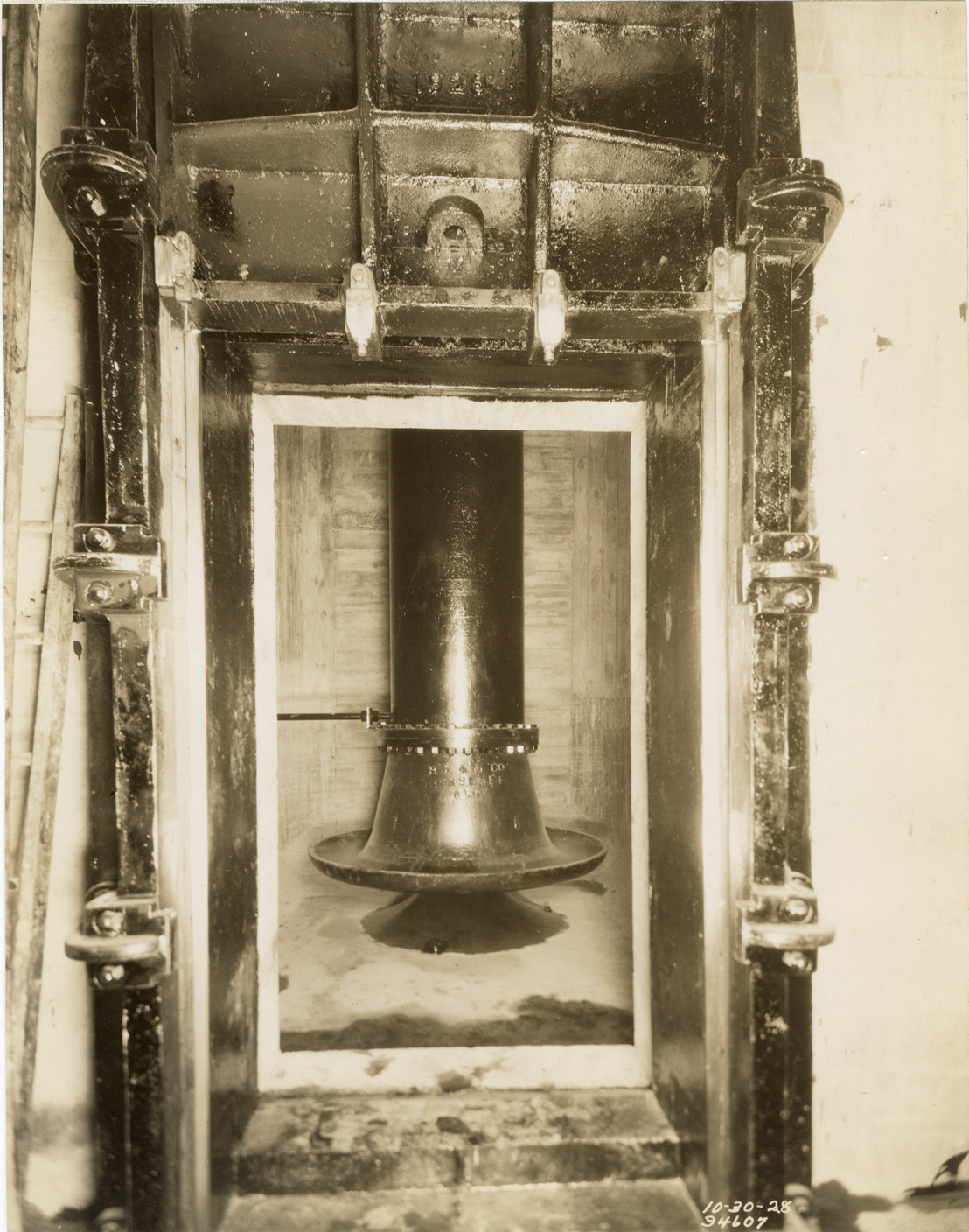 View of pipe valve in sluice gate for suction chamber, Waterworks Park, Detroit water supply system. Printed on front: "10-30-28." Stamped on back: "Manning Bros., commercial photographers. 504-505 Lincoln Building. Corner State and Park Sts., Detroit, Mich." Typed on back: "Water Works Park Sta., Oct. 30, 1928. Suction chamber no. 3 and no. 14. View looking thru sluice gate opening showing pipe valve and cone."