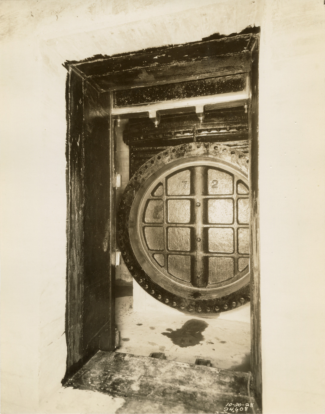 View of disc for gate valve in sluice gate, suction chamber, Waterworks Park, Detroit water supply system. Printed on front: "10-30-28." Stamped on back: "Manning Bros., commercial photographers. 504-505 Lincoln Building. Corner State and Park Sts., Detroit, Mich." Typed on back: "Water Works Park Sta., Oct. 30, 1928. Suction chamber no. 3 and no. 14. View looking thru easterly sluice gate opening at disc of 72" gate valve."