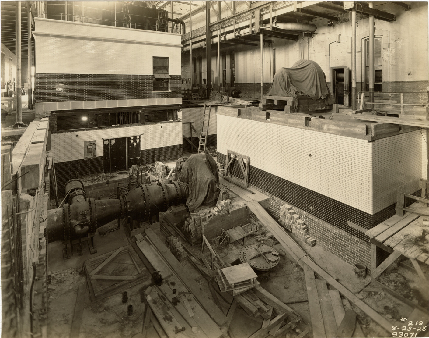 View of pump pit no. 3, Waterworks Park, Detroit water supply system. Printed on front: "8-25-28." Stamped on back: "Manning Bros., commercial photographers. 504-505 Lincoln Building. Corner State and Park Sts., Detroit, Mich." Handwritten on back: "Pump pit #3 looking S.E. showing green and white enameled brick."