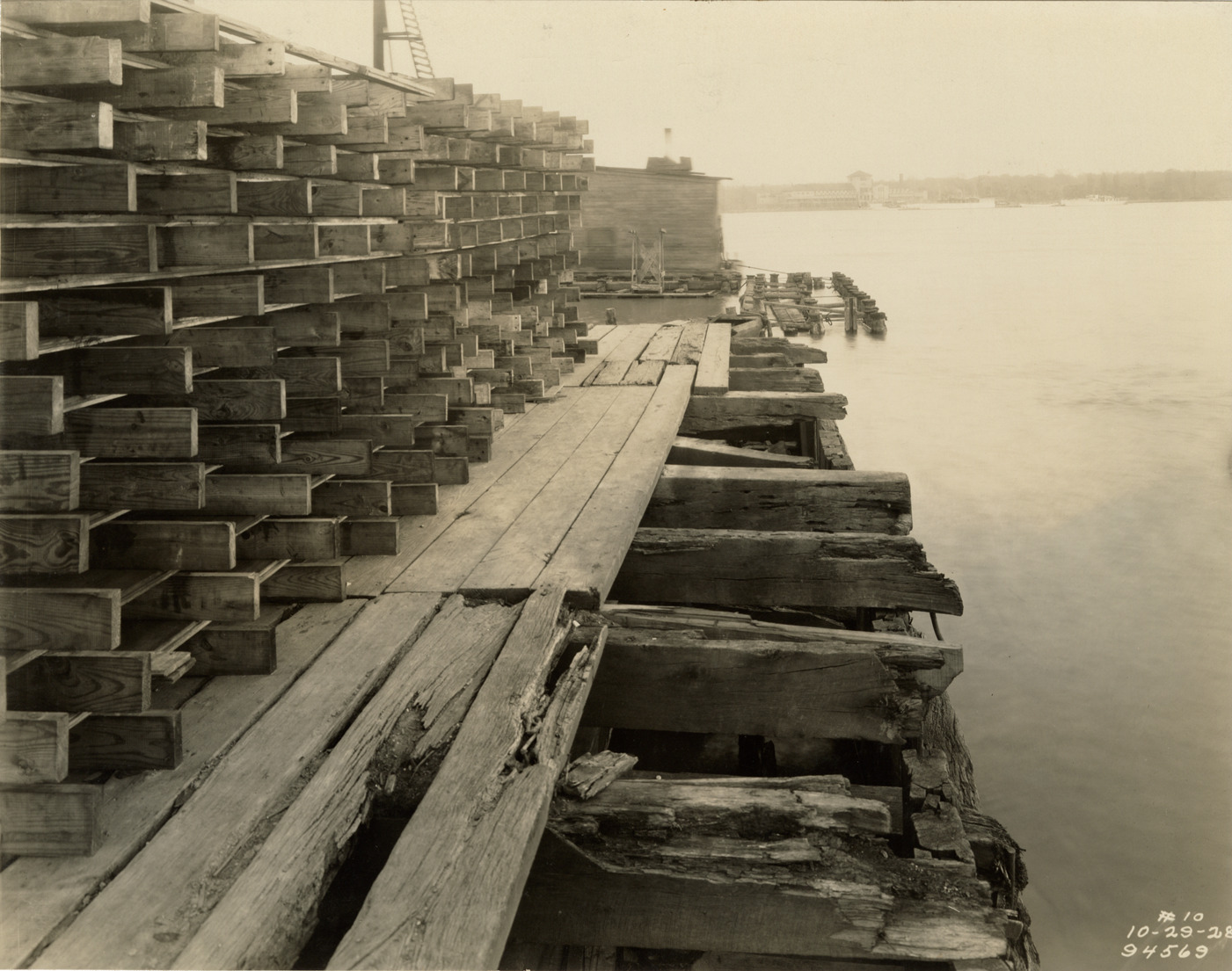 View of old dock, Waterworks Park, Detroit water supply system. Stamped on back: "Manning Bros., commercial photographers. 504-505 Lincoln Building. Corner State and Park Sts., Detroit, Mich." Typed on back: "Water Works Park Station. View looking south along old dock. Oct. 29, 1928."