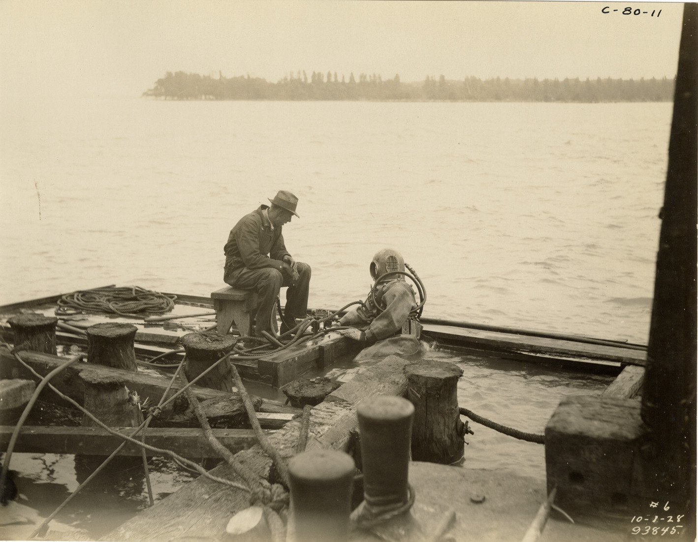 View of man speaking with diver who is boring holes for piles and timbers underwater, Waterworks Park, Detroit water supply system. Printed on front: "10-1-28." Stamped on back: "Manning Bros., commercial photographers. 504-505 Lincoln Building. Corner State and Park Sts., Detroit, Mich." Typed on back: "Diver boring holes for piles and timbers under water, Water Works Park Station. October 1, 1928."