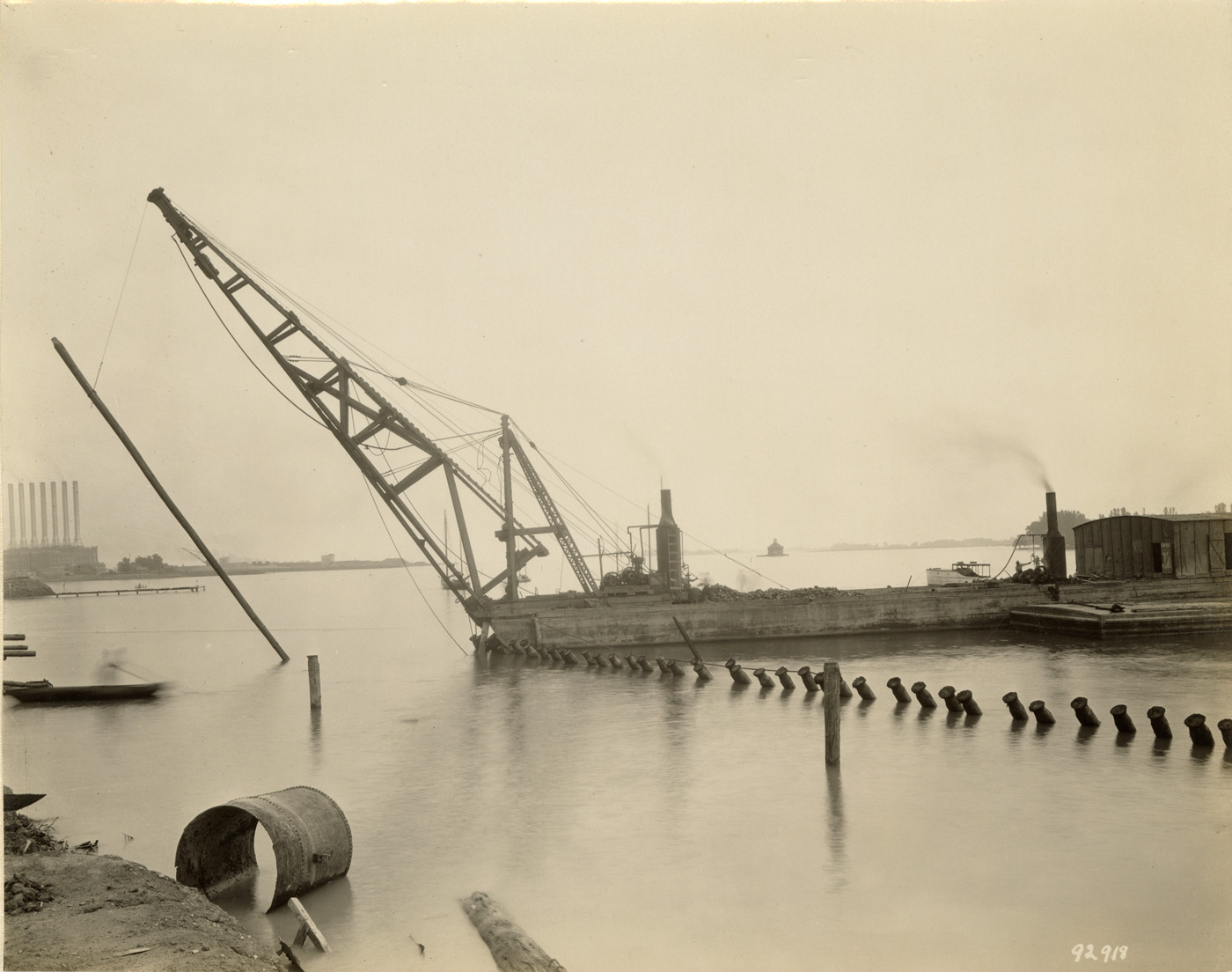 Pile drivers and piling at dock, Waterworks Park, Detroit water supply system