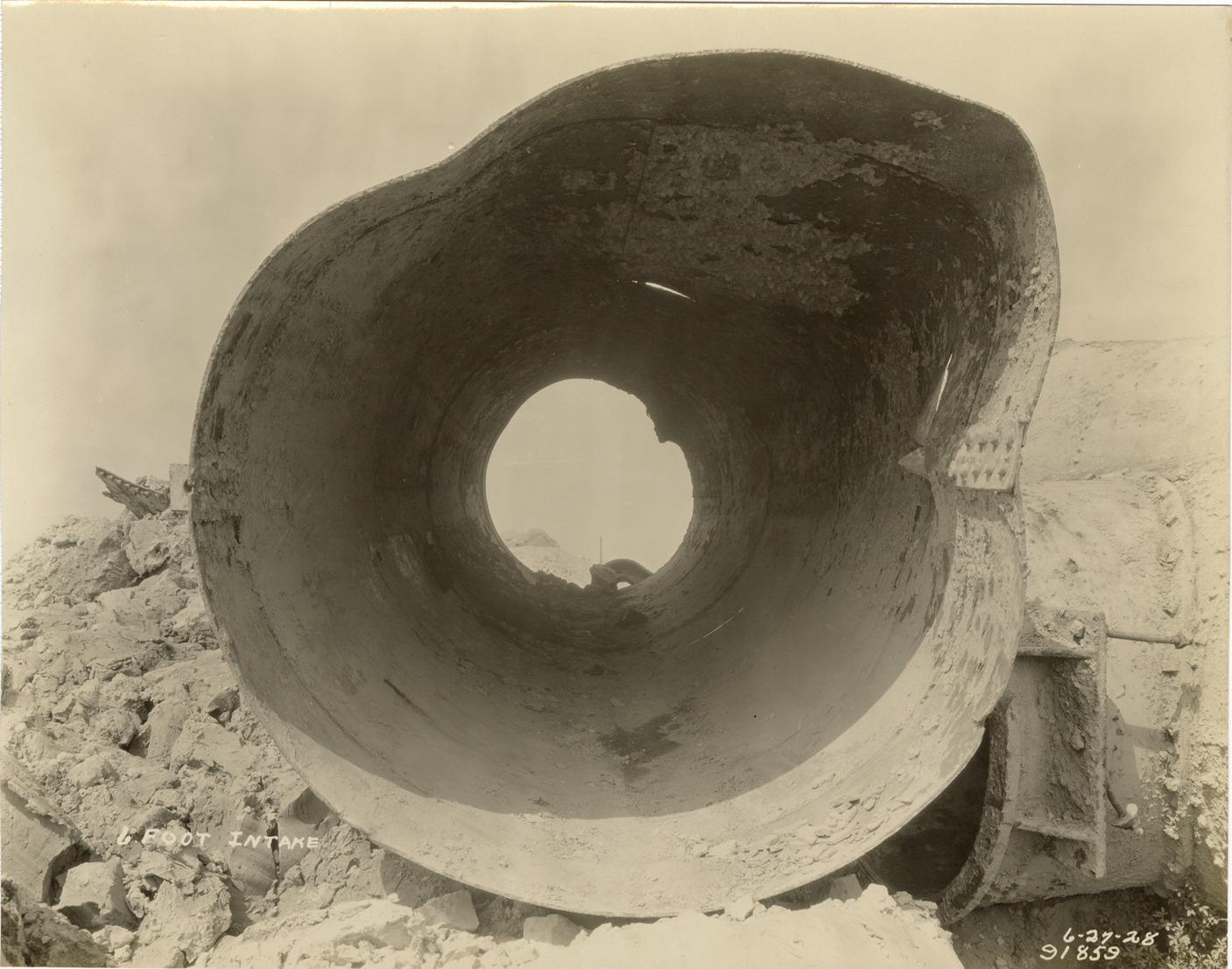 View of 6 foot intake pipe, Waterworks Park, Detroit water supply system. Printed on front: "6 foot intake. 6-27-28." Stamped on back: "Manning Bros., commercial photographers. 504-505 Lincoln Building. Corner State and Park Sts., Detroit, Mich." Typed on back: "6-foot intake. PC-19. Water Works Park. June 27, 1928."