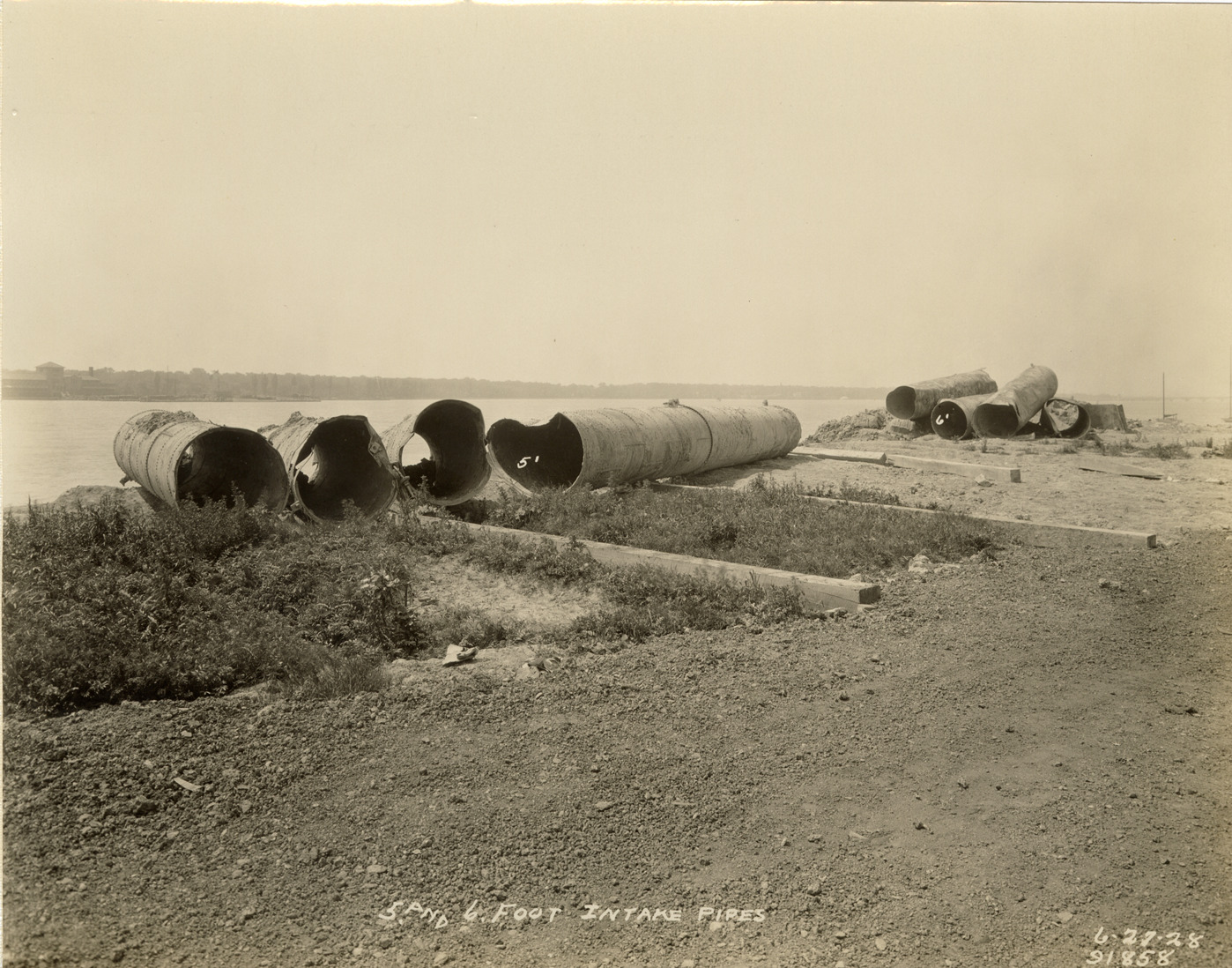 View of 5 and 6 foot intake pipes, Waterworks Park, Detroit water supply system. Printed on front: "5 and 6 foot intake pipes. 6-27-28." Stamped on back: "Manning Bros., commercial photographers. 504-505 Lincoln Building. Corner State and Park Sts., Detroit, Mich." Typed on back: "5 and 6 foot intake pipes. PC-19. Water Works Park. June 27, 1928."
