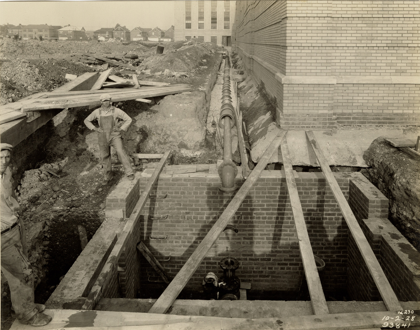 View of two workers posing next to steam line supplying filtration plant, Waterworks Park, Detroit water supply system. Printed on front: "10-2-28." Stamped on back: "Manning Bros., commercial photographers. 504-505 Lincoln Building. Corner State and Park Sts., Detroit, Mich." Typed on back: "Water Works Park Sta. Oct. 2, 1928. Manhole 3 and steam line to supply filter plant. View looking east."