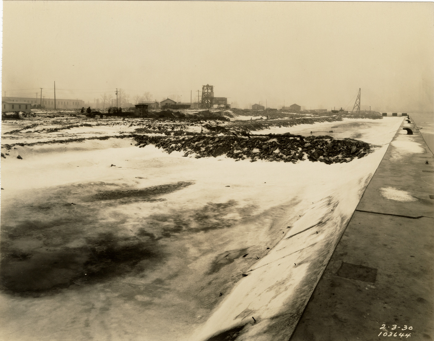 View of dock wall, Waterworks Park, Detroit water supply system. Printed on front: "2-3-30." Stamped on back: "Manning Bros., commercial photographers. 504-505 Lincoln Building. Corner State and Park Sts., Detroit, Mich." Typed on back: "View of dock wall. Water Works Park. Looking east along harbor line."