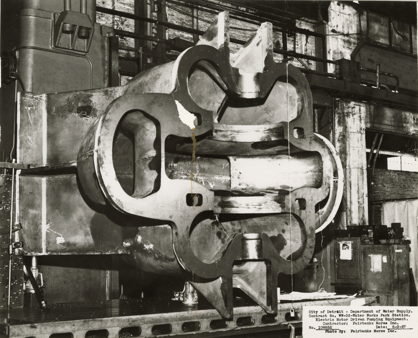 View of pump casing at Waterworks Park, Detroit water supply system. Printed on front: "City of Detroit. Department of Water Supply. Contract no. WW-33. Water Works Park Station. Electric motor driven pumping equipment. Contractor: Fairbanks Morse Inc. No. 10885E. Date: 6-9-67. Photo by Fairbanks Morse Inc." Typed on back: "Contract no. WW-33. Photo no. 1. 6-9-67. Pump casing, bottom half."