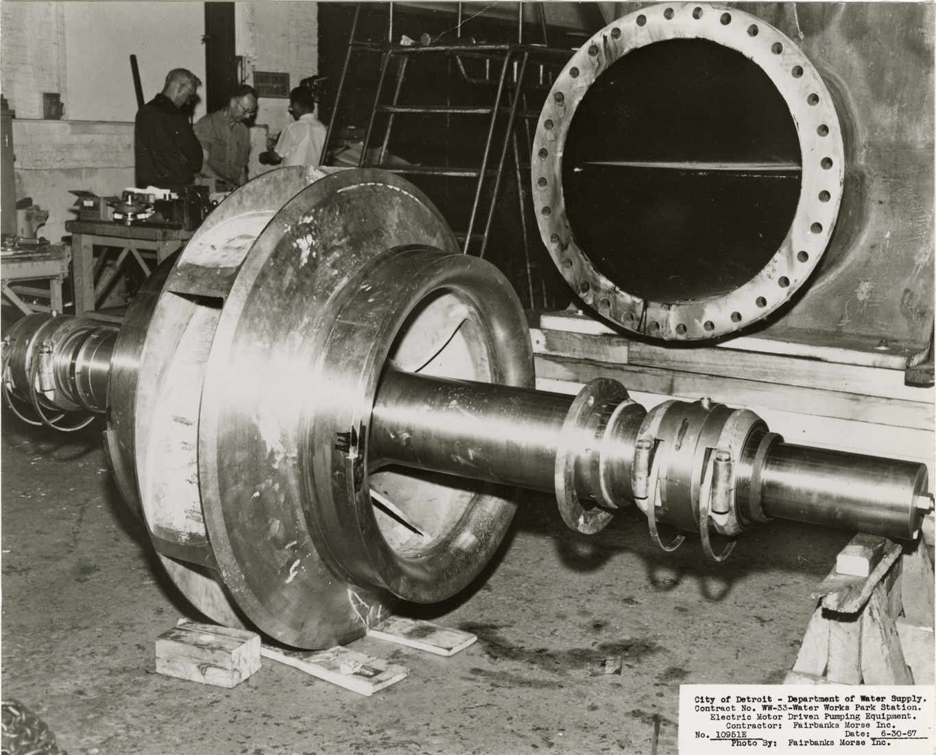View of pump impeller and shaft assembly, Waterworks Park, Detroit water supply system. Workers in background. Printed on front: "City of Detroit. Department of Water Supply. Contract no. WW-33. Water Works Park Station. Electric motor driven pumping equipment. Contractor: Fairbanks Morse Inc. No. 10951E. Date: 6-30-67. Photo by Fairbanks Morse Inc." Typed on back: "Contract no. WW-33. Photo no. 6. 6-30-67. Impeller and shaft assembly."