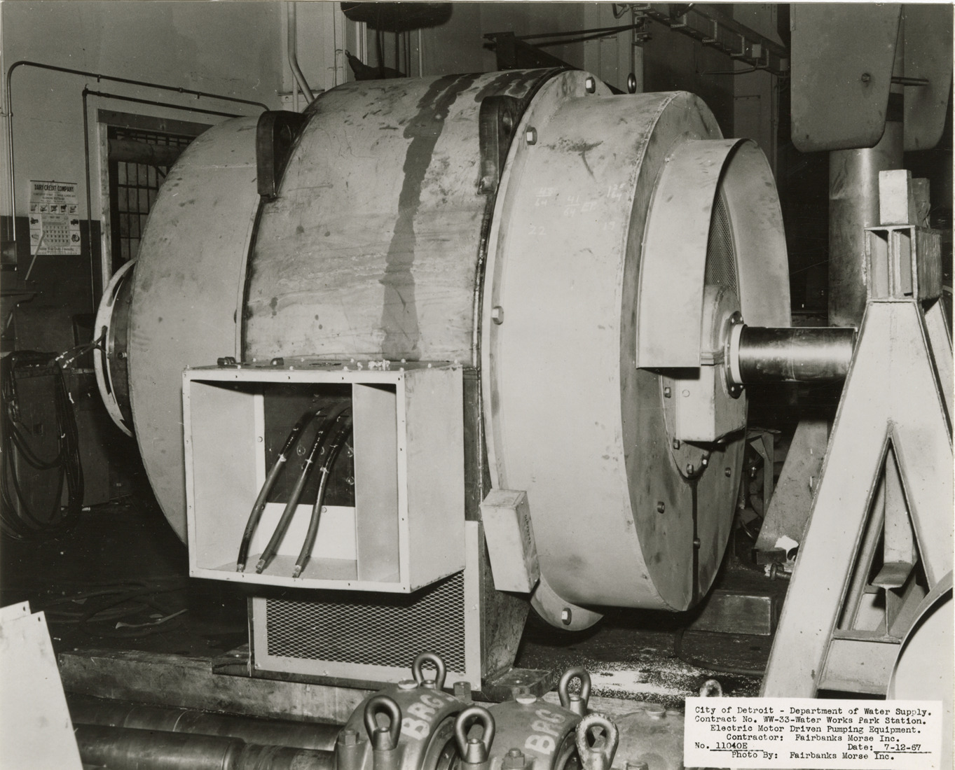 View of pump motor, Waterworks Park, Detroit water supply system. Printed on front: "City of Detroit. Department of Water Supply. Contract no. WW-33. Water Works Park Station. Electric motor driven pumping equipment. Contractor: Fairbanks Morse Inc. No. 11040E. Date: 7-12-67. Photo by Fairbanks Morse Inc." Typed on back: "Contract no. WW-33. Photo no. 12. 7-12-67. Motor before painting."