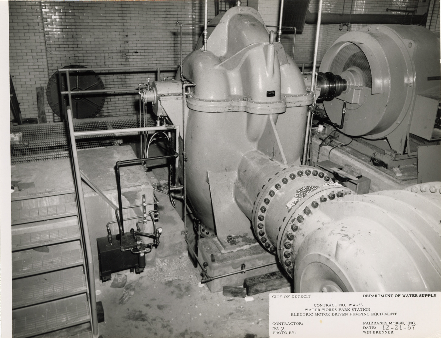 View of pumping unit no. 2, Waterworks Park, Detroit water supply system. Printed on front: "City of Detroit. Department of Water Supply. Contract no. WW-33. Water Works Park Station. Electric motor driven pumping equipment. Contractor: Fairbanks Morse Inc. No. 2. Date: 12-21-67. Photo by Win Brunner." Typed on back: "Looking south, pumping unit no. 2."