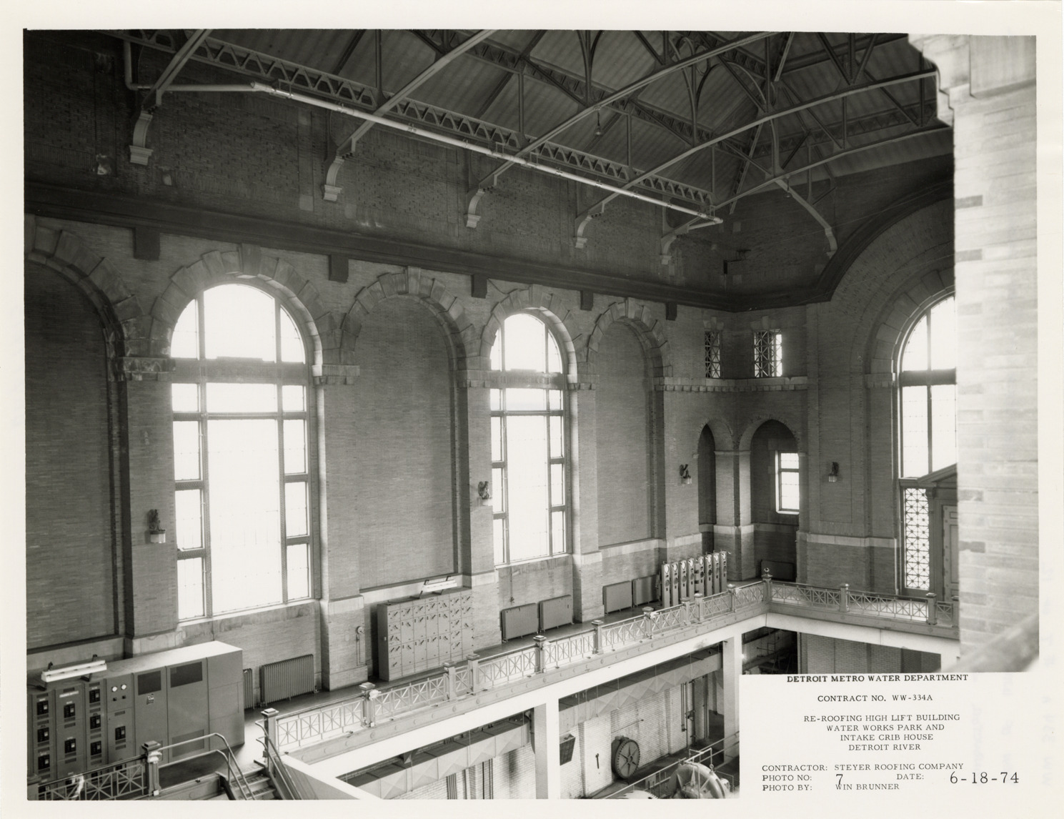 View of interior of high lift plant, Waterworks Park, Detroit water supply system. Printed on front: "Detroit Metro Water Department. Contract no. WW-334A. Re-roofing high lift building. Water Works Park and intake crib house, Detroit River. Contractor: Steyer Roofing Company. Photo no. 7. Date: 6-18-74. Photo by Win Brunner." Handwritten on back: "WW 334A, #7 of 12. View of interior S.W. corner of the high lift bldg. showing the horizontal conductor joining drains #2 & #3."