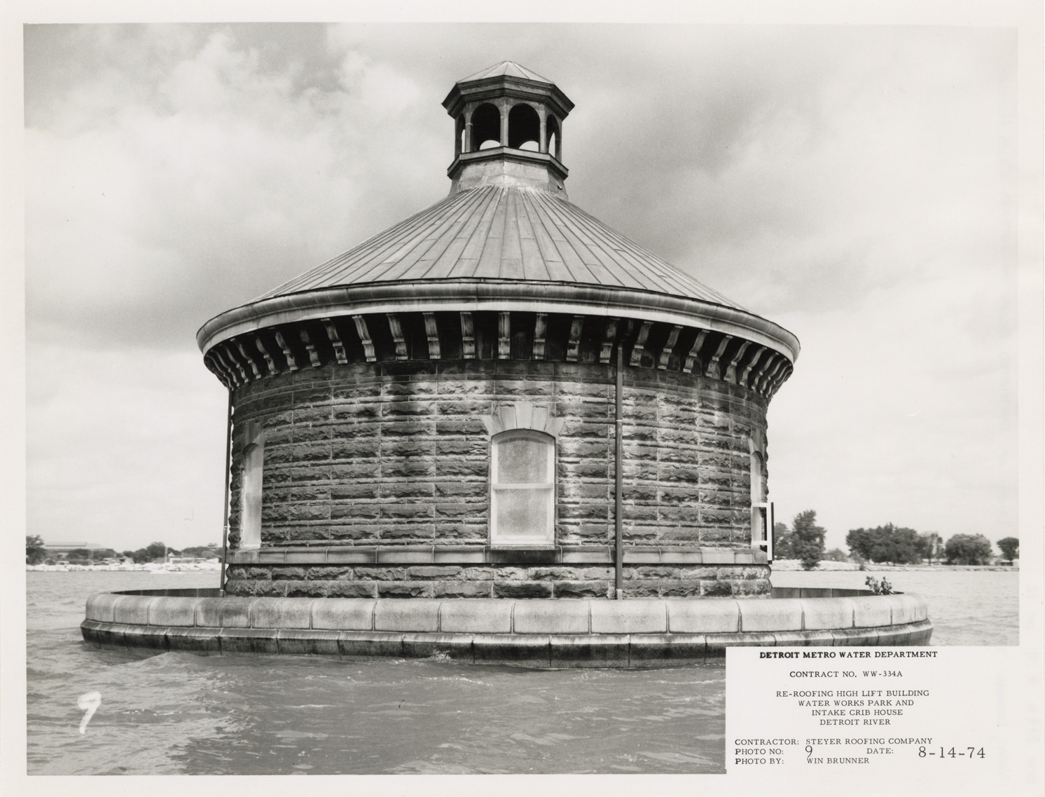 View of intake crib, Waterworks Park, Detroit water supply system. Printed on front: "Detroit Metro Water Department. Contract no. WW-334A. Re-roofing high lift building. Water Works Park and intake crib house, Detroit River. Contractor: Steyer Roofing Company. Photo no. 9. Date: 8-14-74. Photo by Win Brunner." Handwritten on back: "WW 334A, #9 of 12. View, looking toward Belle Isle, of completed roof on intake crib house."