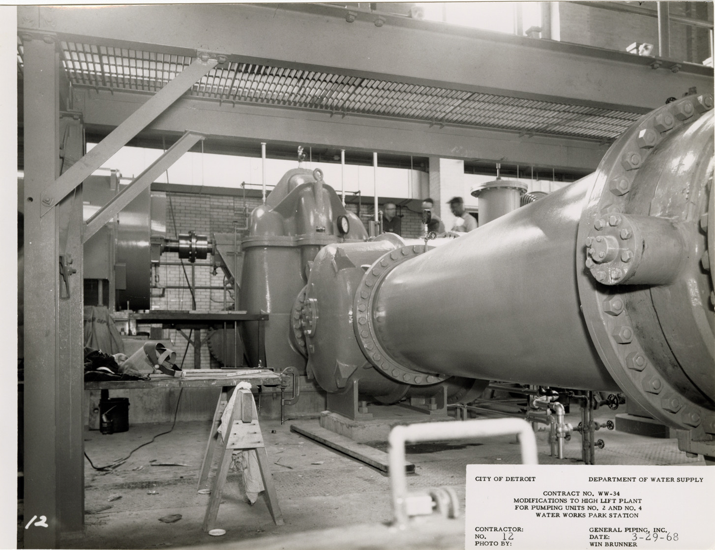 View of pump no. 4, Waterworks Park, Detroit water supply system. Printed on front: "City of Detroit. Department of Water Supply. Contract no. WW-34. Modifications to high lift plant for pumping units no. 2 and no. 4. Water Works Park Station. Contractor: General Piping, Inc. No. 12. Date: 3-29-68. Photo by: Win Brunner." Typed on back: "Pumping unit #4. View of the new reducer, new cone valve and pumping unit ready for operation."