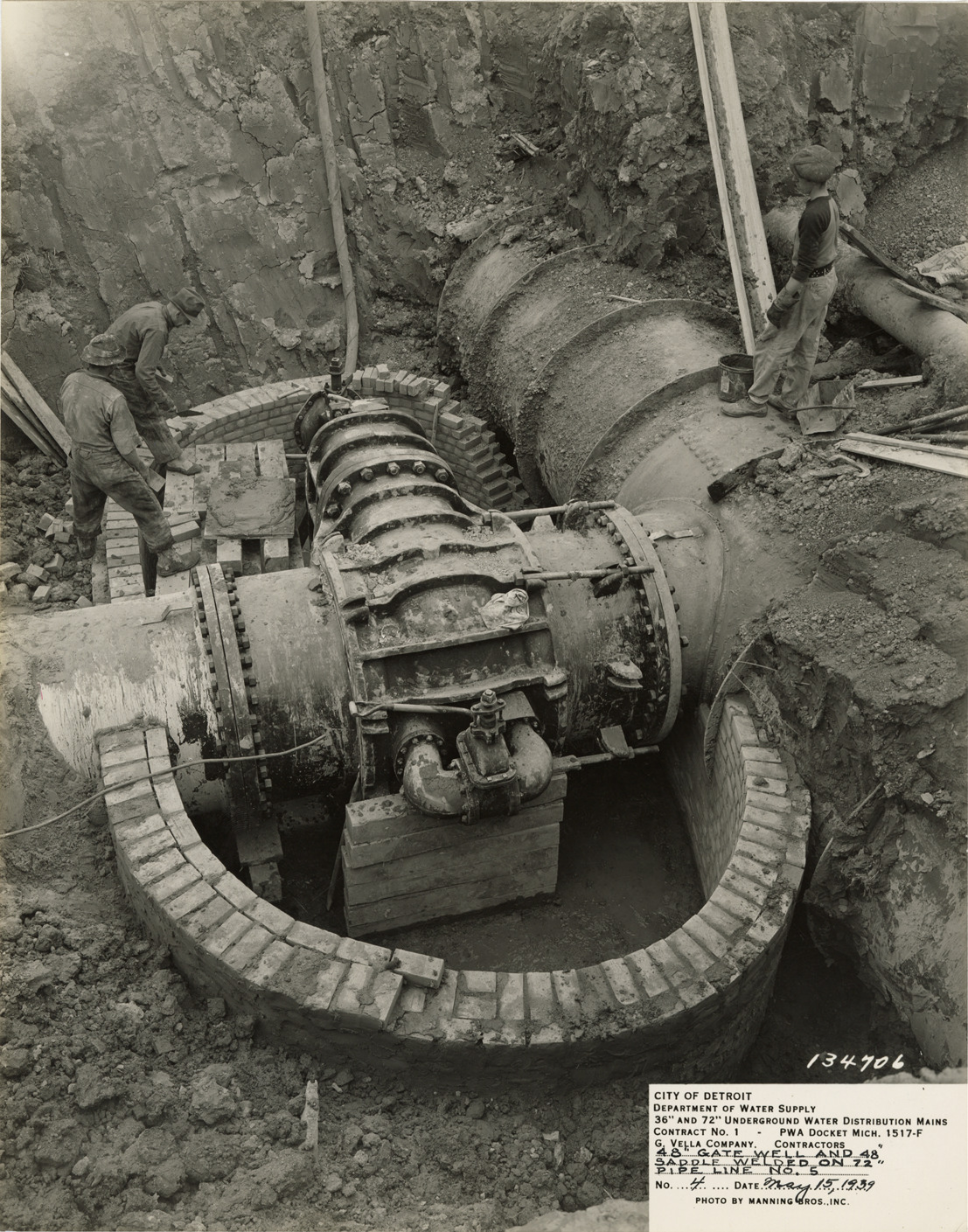 View of workers constructing gate well, Detroit water supply system. Printed on front: "City of Detroit. Department of Water Supply. 36" and 72" underground water distribution main. Contract no. 1. PWA docket Mich. 1517-F. G. Vella Company, contractors. 48" gate well and 48" saddle welded on 72" pipe line no. 5. No. 4. Date: May 15, 1939. Photo by Manning Bros., Inc."