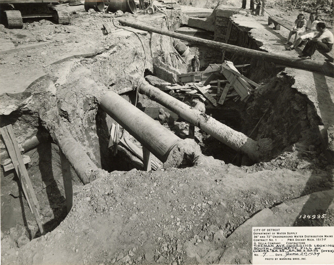View of water main work on Tireman Ave., Detroit water supply system. Printed on front: "City of Detroit. Department of Water Supply. 36" and 72" underground water distribution main. Contract no. 1. PWA docket Mich. 1517-F. G. Vella Company, contractors. Tireman Ave. crossing looking south, concrete fill on curves SA 35, SA 36 & SA 39 (over). No. 7. Date: June 20, 1939. Photo by Manning Bros., Inc." Handwritten on back: "Description continued: 36" connection to 72" line, P.L.C. 24,000 volt cables, 16" water line and 2 gas lines."