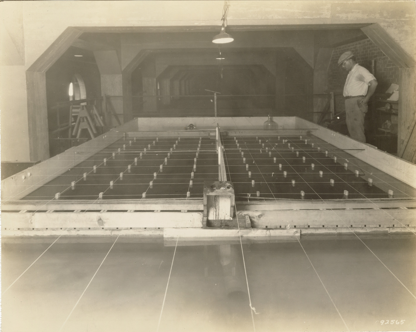 View of a worker looking at a model coagulation basin, Waterworks Park, Detroit water supply system. Stamped on back: "Manning Bros., commercial photographers. 504-505 Lincoln Building. Corner State and Park Sts., Detroit, Mich." Typed on back: "Model coagulation basin at Water Works Park. Arrangement is an experimental trial for the Springwells Plant."