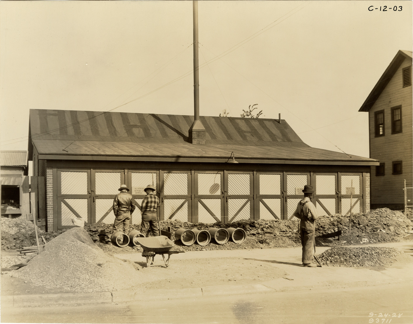 View of workers standing in front of garage, Springwells Station, Detroit water supply system. Printed on front: "9-24-28." Stamped on back: "Manning Bros., commercial photographers. 504-505 Lincoln Building. Corner State and Park Sts., Detroit, Mich." Typed on back: "Springwells Station garage, front view from W. Warren Ave., Sept. 24, 1928."