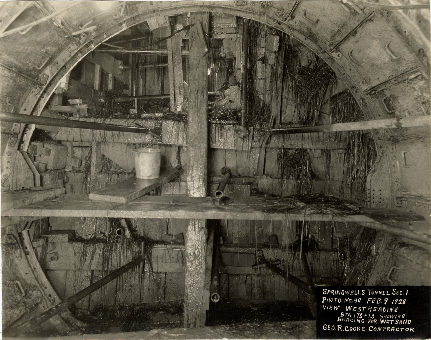 View of west heading of tunnel, Springwells Station, Detroit water supply system. Printed on front: "Springwells tunnel. Sec. 1. Photo no. 40. Feb. 9, 1928. View west heading. Sta. 178 & 13 showing bracing for wet sand. Geo. R. Cooke, contractor." Stamped on back: "American Commercial Photo Co. 25 Parsons St. Detroit, Mich. Glendale 7152."