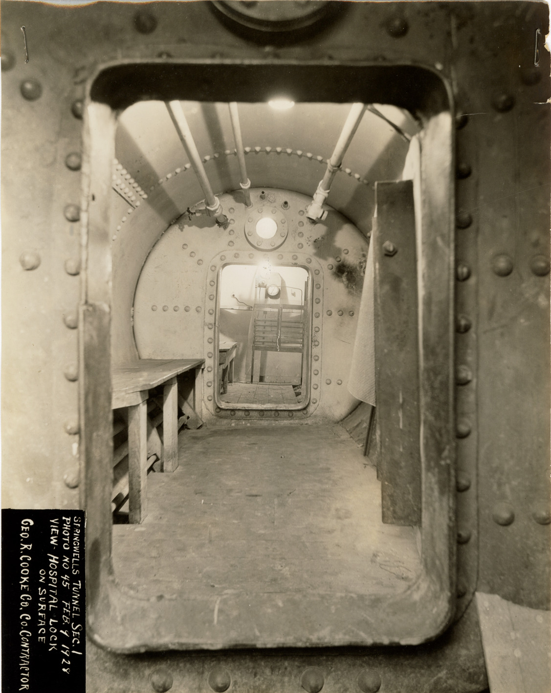 View of tunnel, Springwells Station, Detroit water supply system. Printed on front: "Springwells tunnel. Sec. 1. Photo no. 45. Feb. 9, 1928. View hospital lock on surface. Geo. R. Cooke, contractor."
