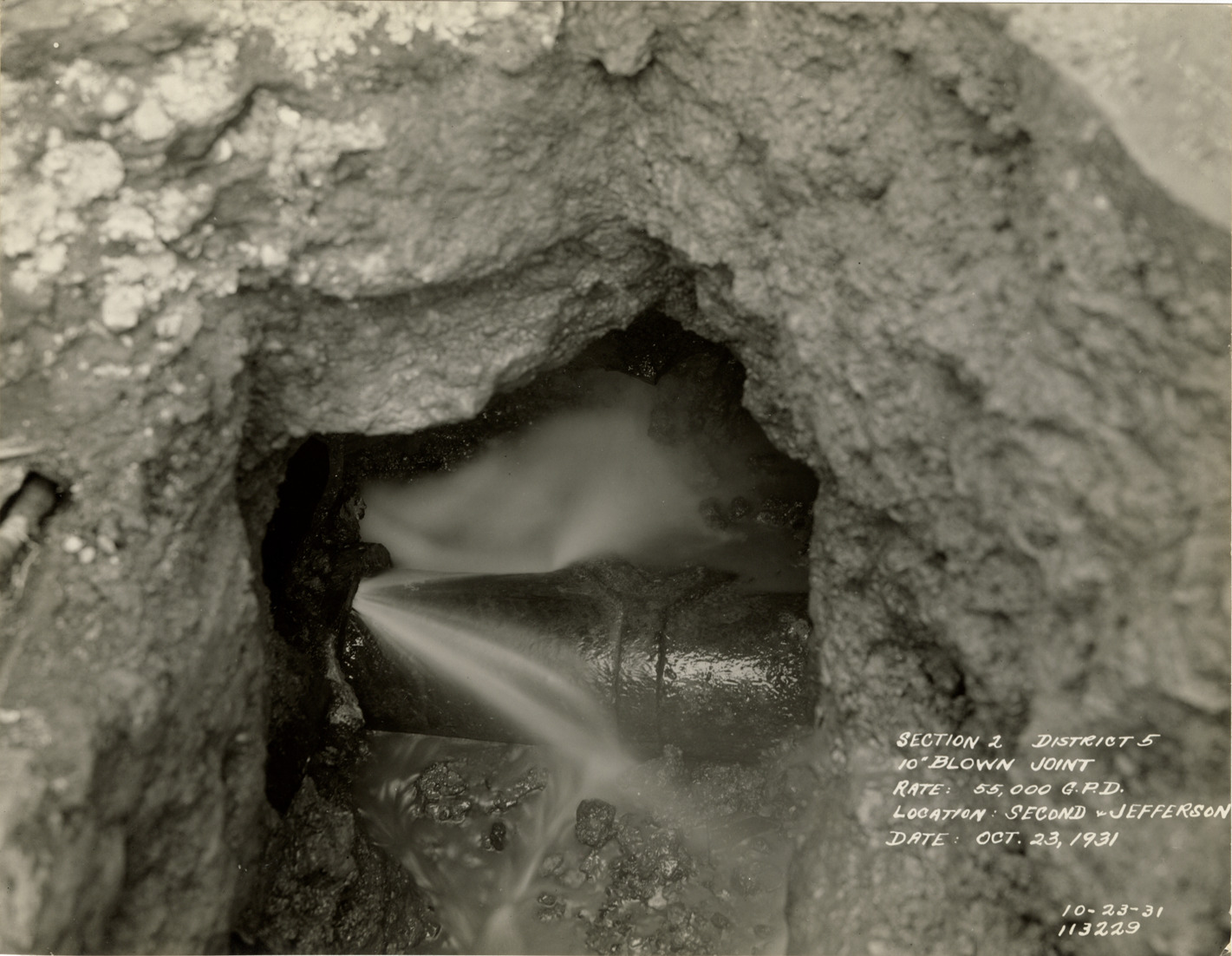View of blown joint at Second Blvd. and Jefferson Ave., Detroit water supply system. Printed on front: "Section 2, District 5. 10" blown joint. Rate: 55,000 G.P.D. Location: Second & Jefferson. Date: Oct. 23, 1931." Stamped on back: "Manning Bros., commercial photographers. 504-505 Lincoln Building. Corner State and Park Sts., Detroit, Mich."
